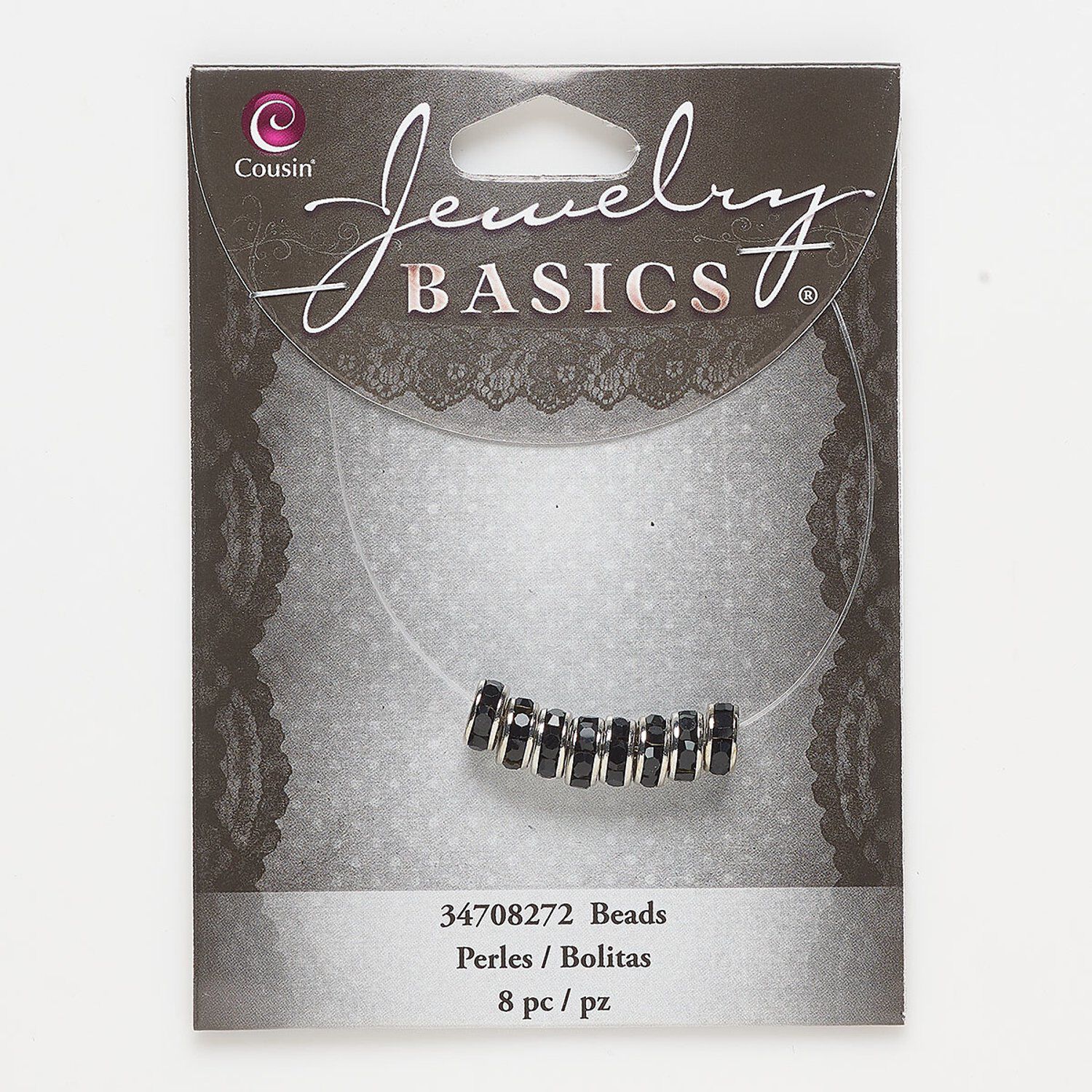 Bead, silver-finished "pewter" (zinc-based alloy) and glass, black, 7x3mm rondelle. Sold per pkg of 8.