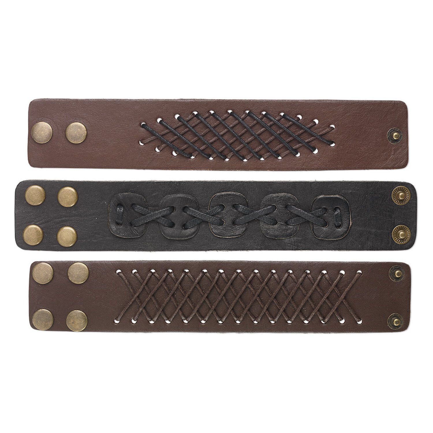 Bracelet mix, leather (dyed) / waxed cotton cord / brass-finished steel, brown and dark brown, 38mm wide, adjustable at 6 and 7 inches with snap closure. Sold per pkg of 3.