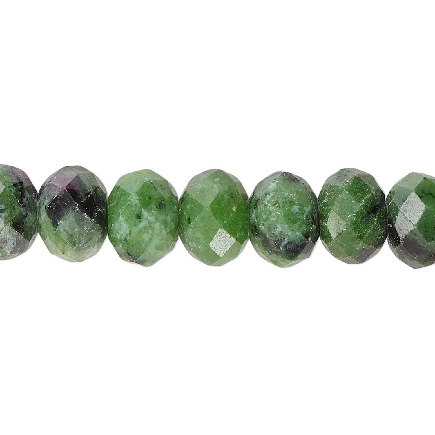 Occasional deep red ruby crystals give lush green zoisite a rich overall appearance. Ruby in zoisite is also known anyolite, a name derived from the Masai word "anyoli" meaning "green." Each B grade gemstone bead is machine-cut and faceted for consistent size and shape.
