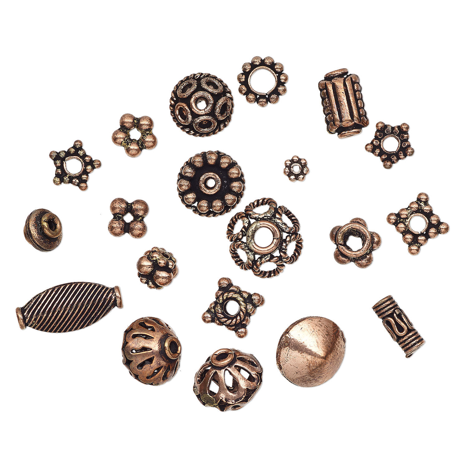 Package of 100% copper beads and bead caps feature an antiqued finish in a mix of shapes and sizes.