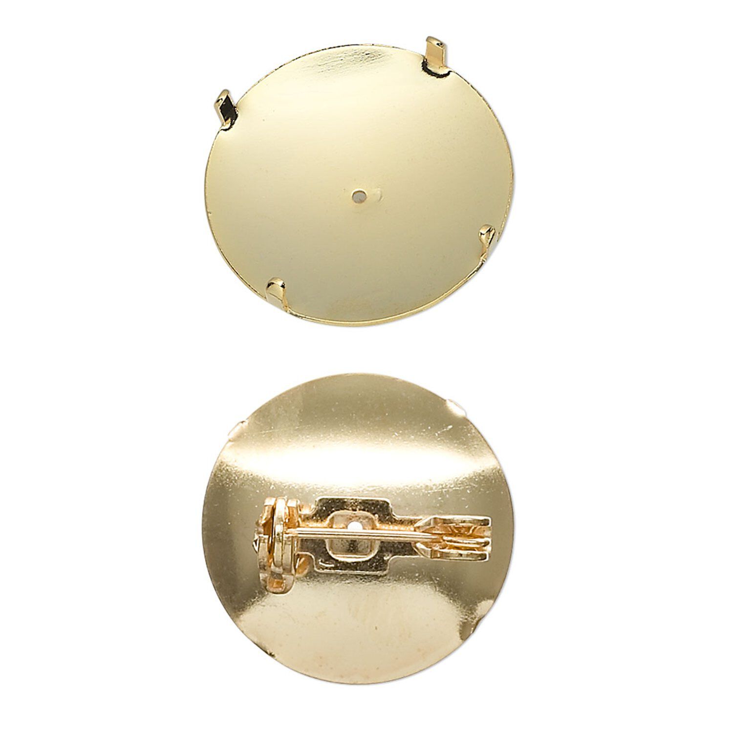 Pin back, gold-plated steel, 19mm 4-prong round. Sold per pkg of 10.