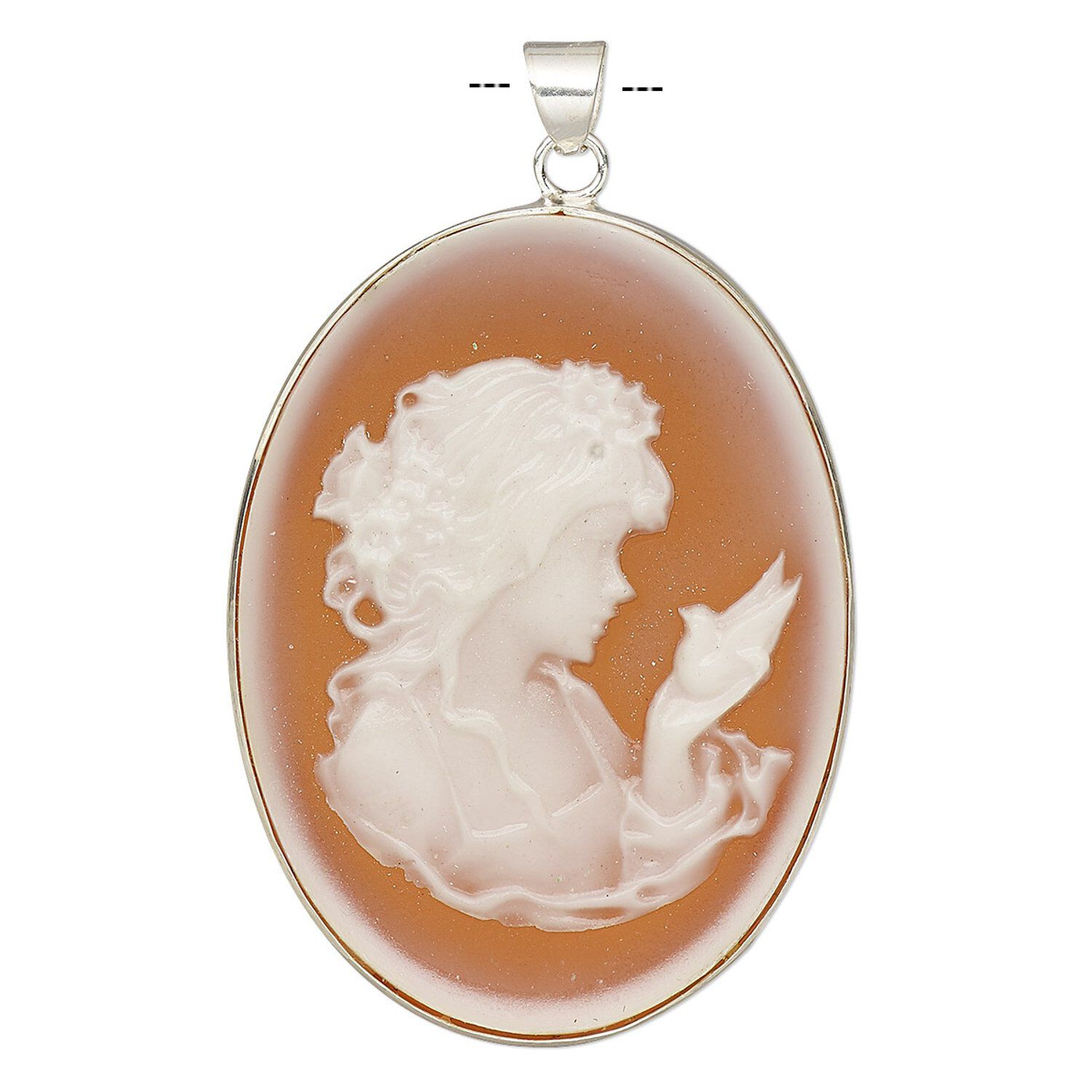 Pendant, acrylic and sterling silver, orange and white, 41x31mm oval cameo with woman and dove. Sold individually.