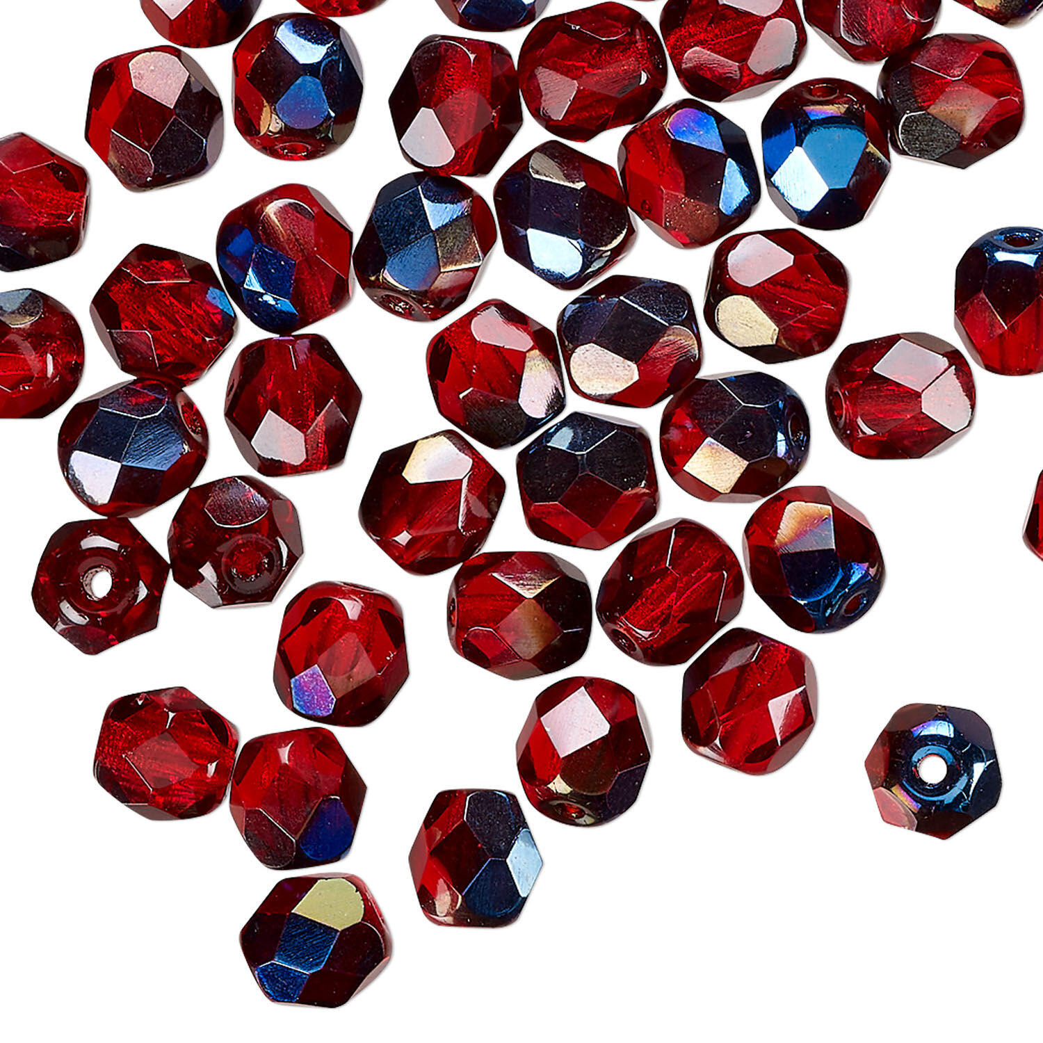 Bead 1pkg60 Czech fire-polished glass, red blue iris, 6mm faceted round.
