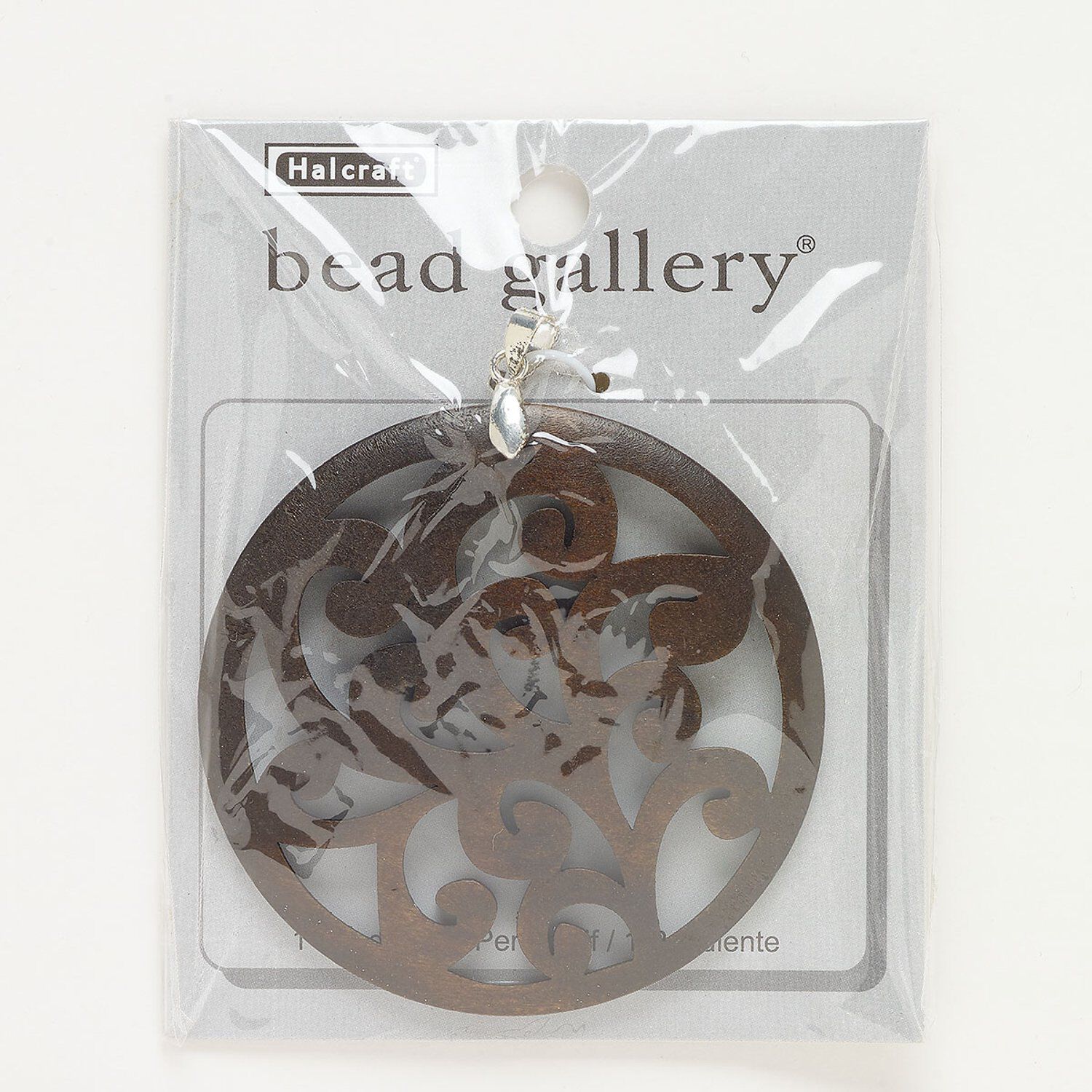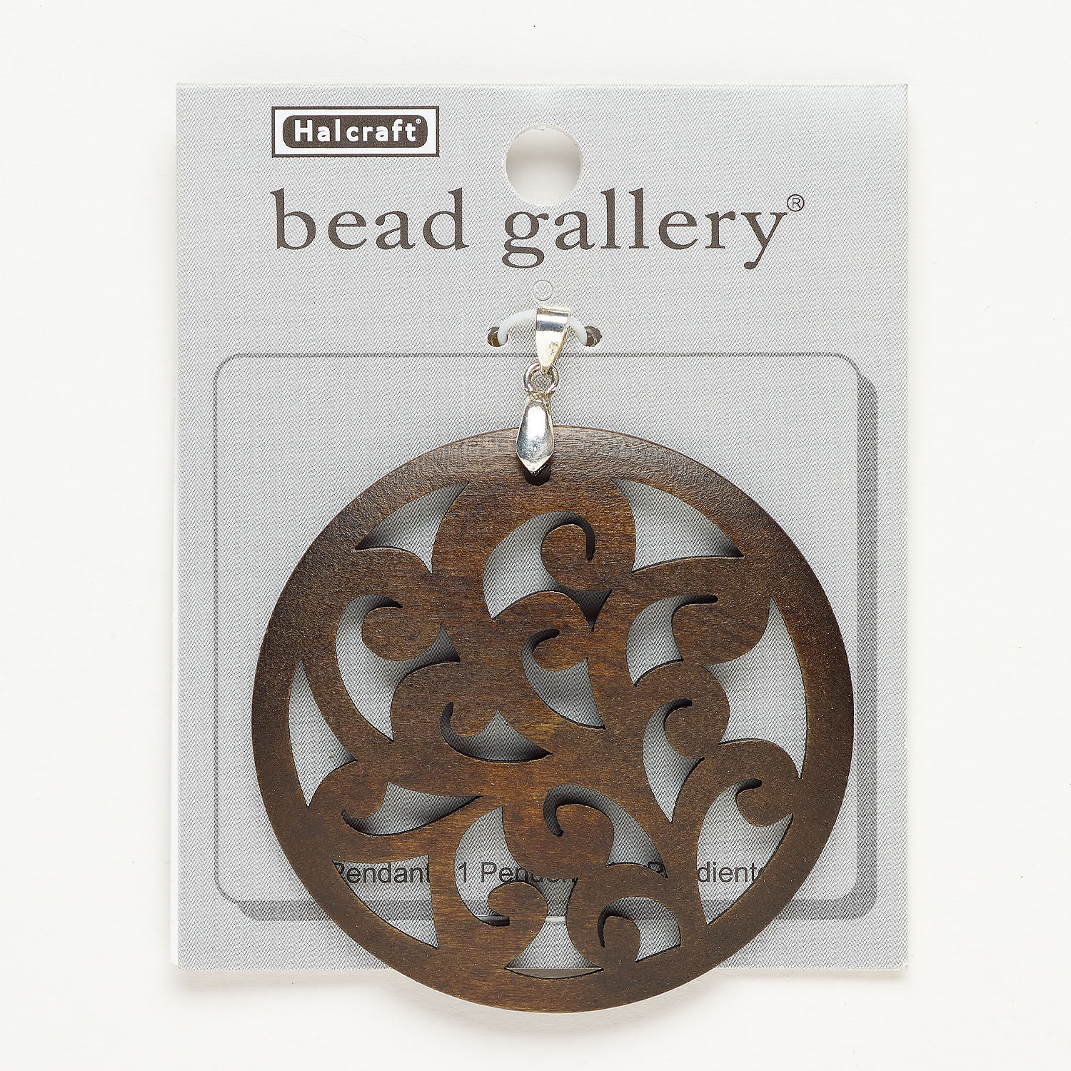 Pendant, silver-finished "pewter" (zinc-based alloy) and wood (dyed), dark brown, 60mm carved round with cutout swirls. Sold individually.