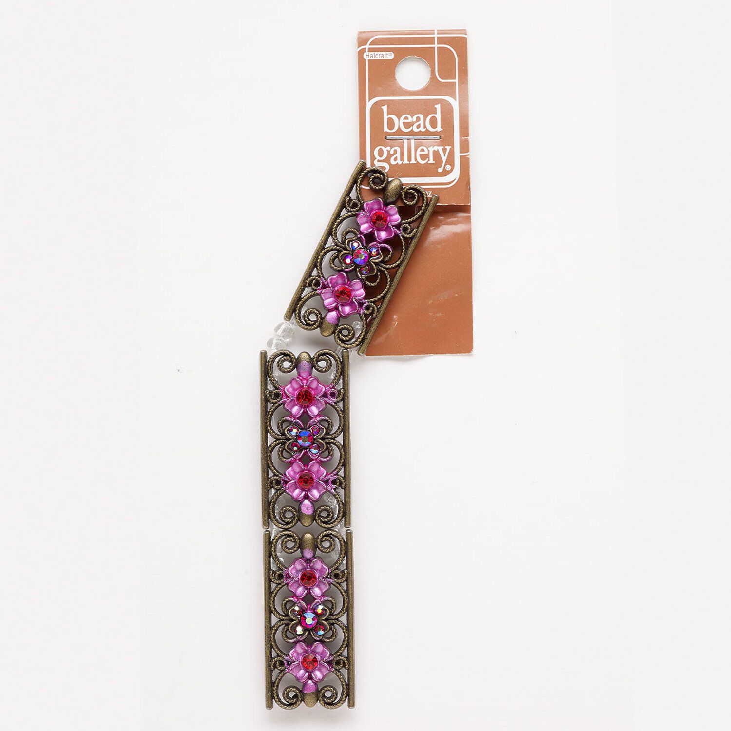 Spacer, antique gold-finished "pewter" (zinc-based alloy) and glass, fuchsia and red, 41x21mm with flowers and hidden loops, spacer fits up to 15mm beads. Sold per pkg of 3.