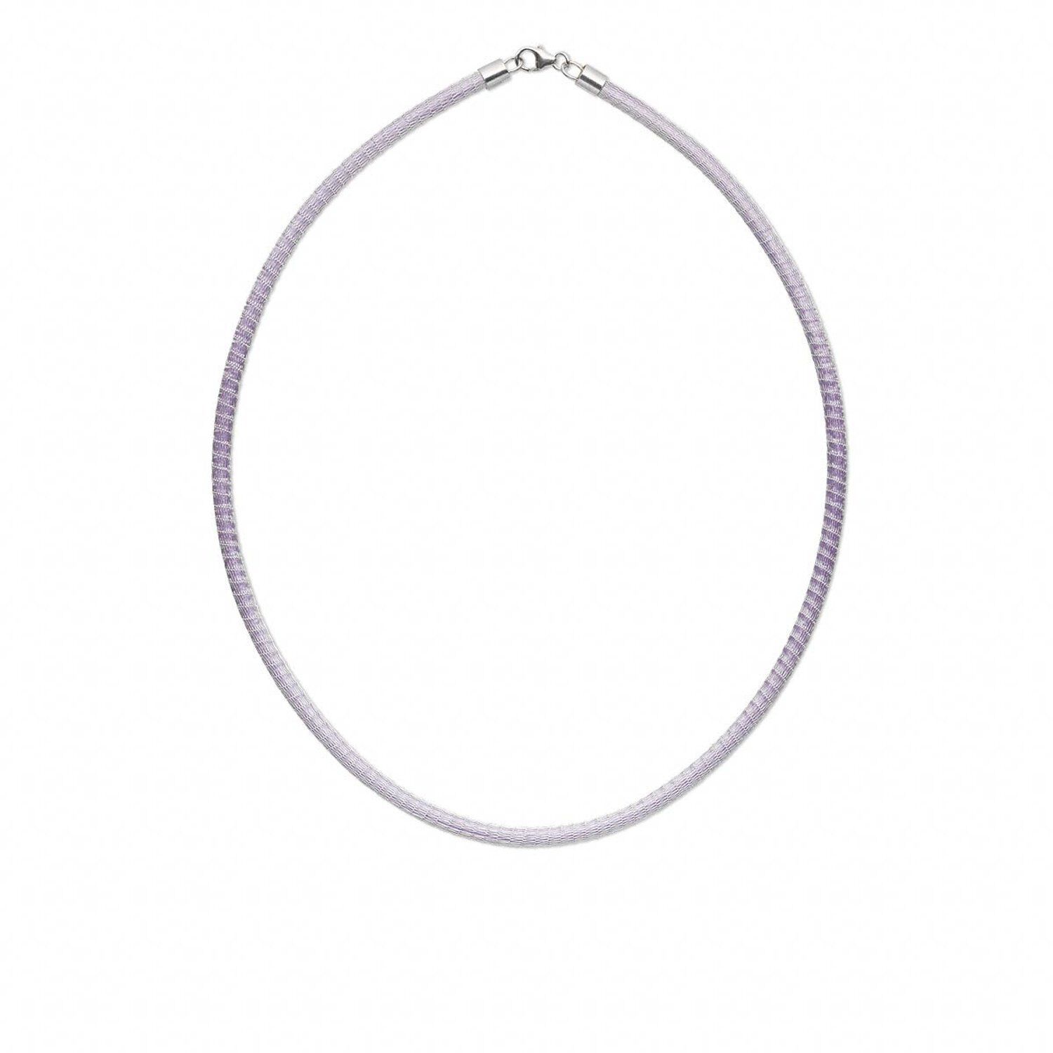 Fine, Italian brass mesh necklaces--perfect for large-bail pendants and large-hole beads. Silver- and purple-colored brass mesh wraps around leatherette cord for a vivid contrast. Finished with an imitation rhodium-finished sterling silver lobster claw clasp. Necklace fits beads or large bails with a 6mm or larger hole size.