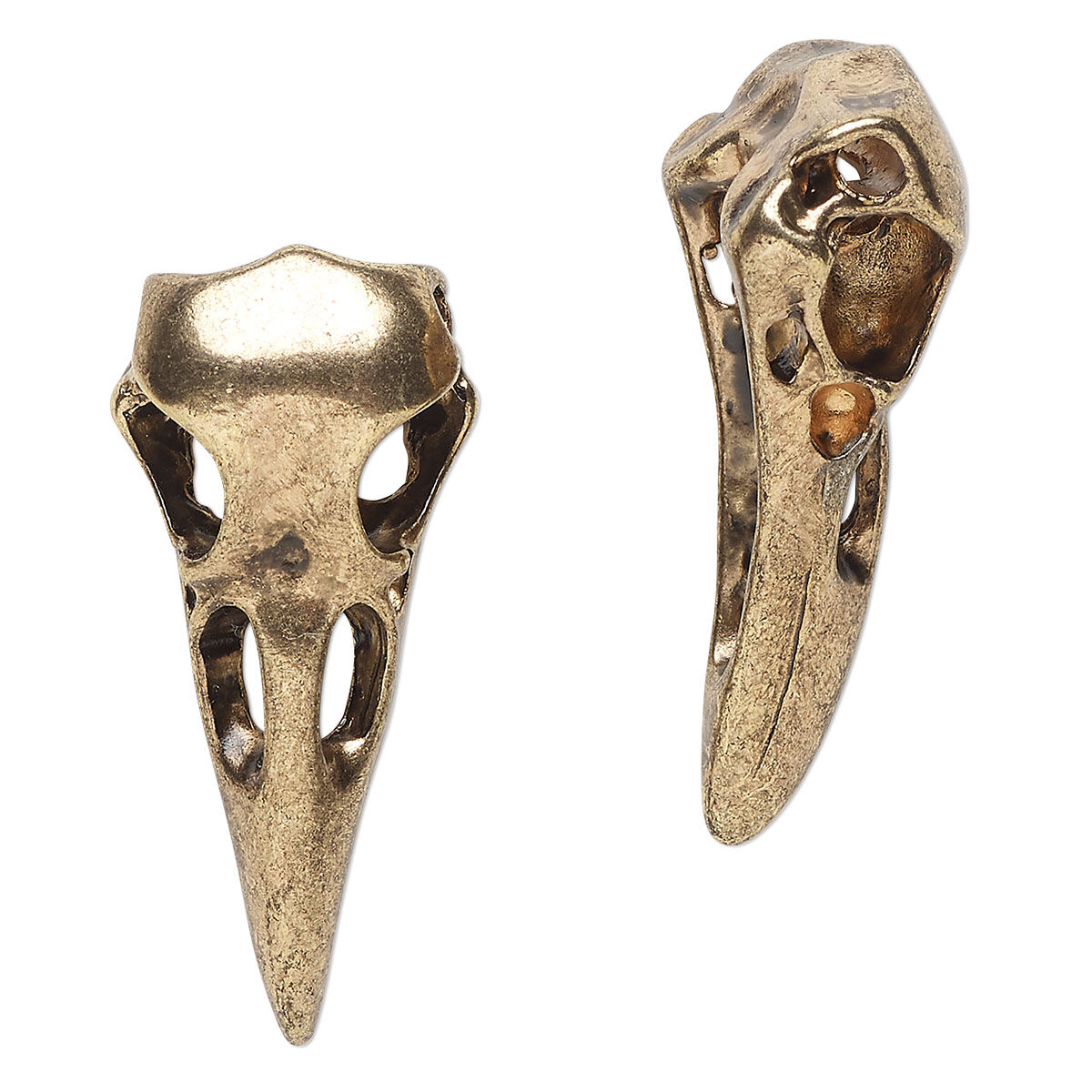 Focal, antique brass finish "pewter" (zinc-based alloy), 41x18mm 3D raven skull. Sold per pkg of 2.