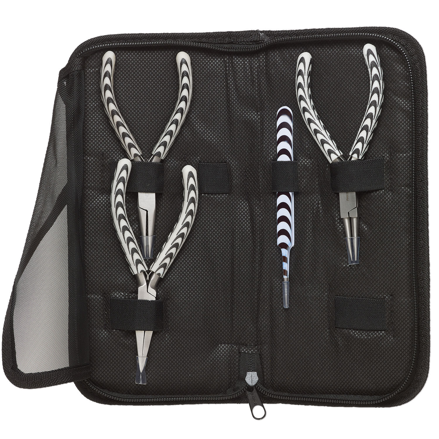 Pliers set, stainless steel / PVC foam / vinyl, black and white, 5-1/2 inch pliers / 5-1/4 inch tweezers / 10 x 4-1/2 x 1-1/2 inch case.