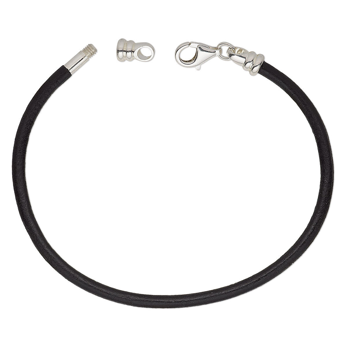 Bracelet cord, Dione®, leather (dyed) and sterling silver, black, 3mm round with twist-off end, 7-1/2 inches with lobster claw clasp. Sold individually.