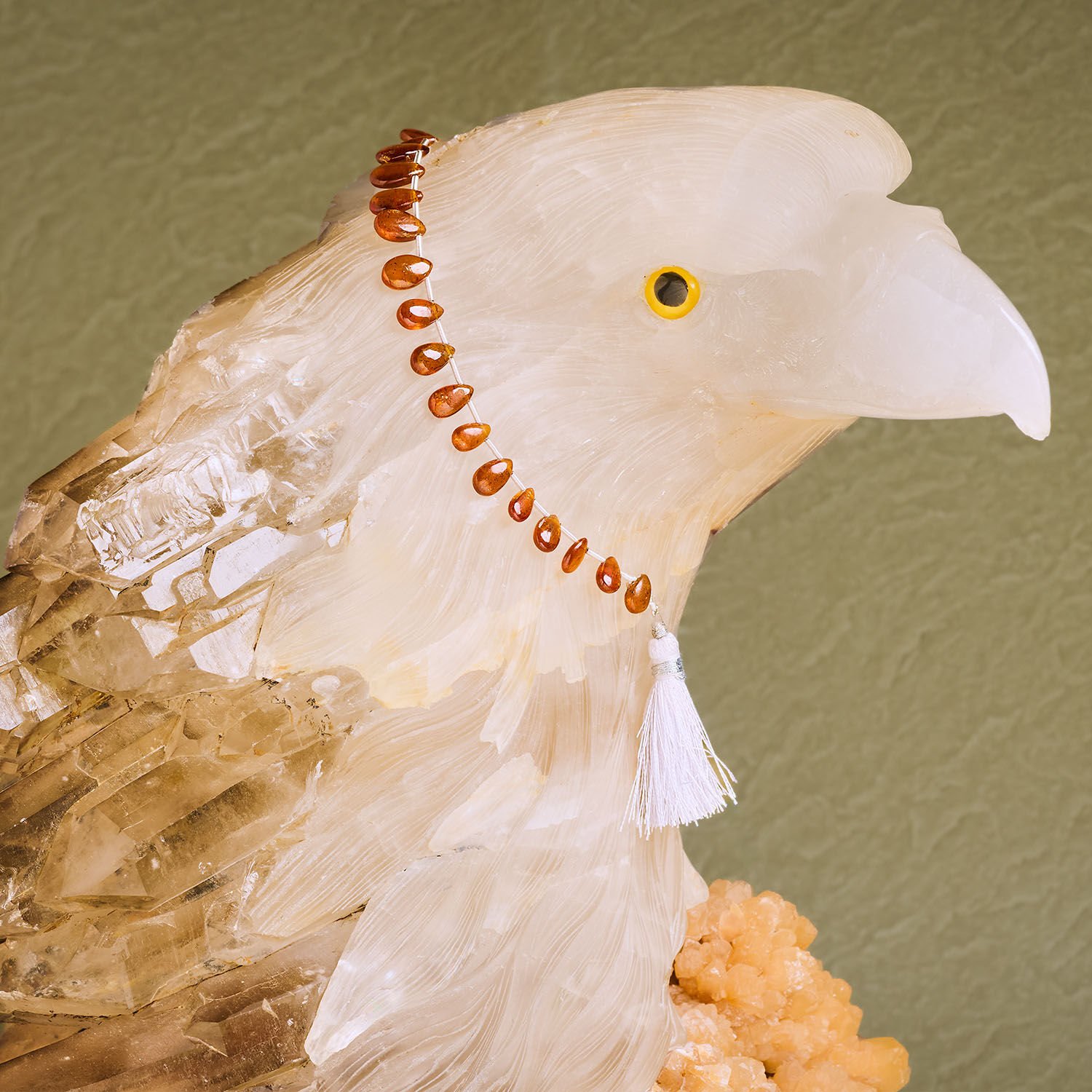 Tiny drill holes (0.4–0.8mm) make them ideal for fine-gauge wire and delicate stringing, while their transparent-to-translucent finish reveals flashes of silver schiller and iron inclusions that catch the light. Graduated 8-inch strands are temporarily strung with spacers and silk tassels to prevent chipping and ensure safe handling.