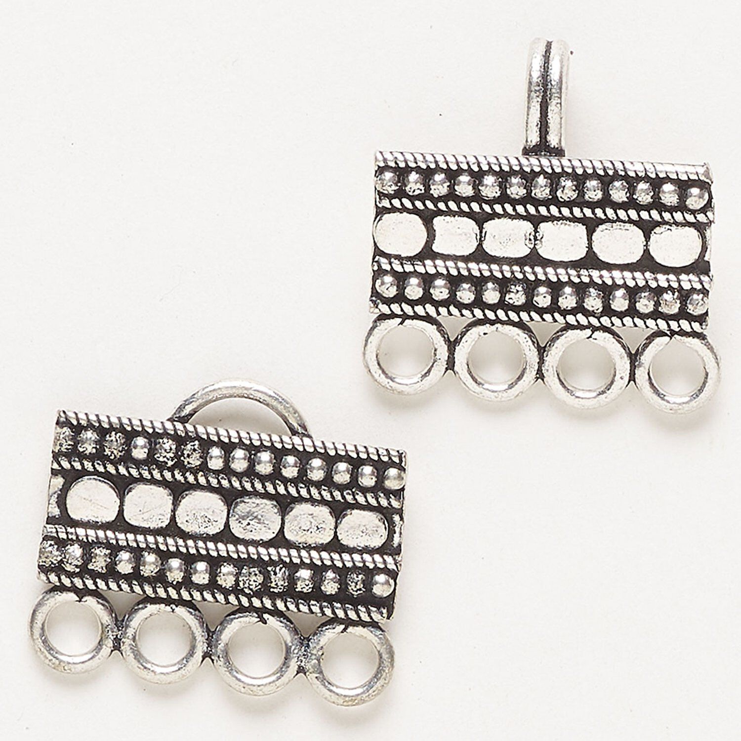 Clasp, 4-strand hook-and-eye, antique silver-finished "pewter" (zinc-based alloy), 29x21mm rectangle with dots and rope edges. Sold individually.