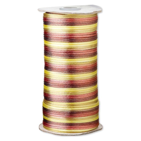 At 2mm, regular satin cord offers boundless possibilities for beading, braided kumihimo creations, knot template projects and much more. Colors can include brown, yellow, pink, gold, mauve and more. Due to the manufacturing process, cord may be in 2 or 3 sections joined by knots. Sizes are approximate and may vary. Colors may vary from dye lot to dye lot. Testing for colorfastness is recommended. Spool is packaged by weight.