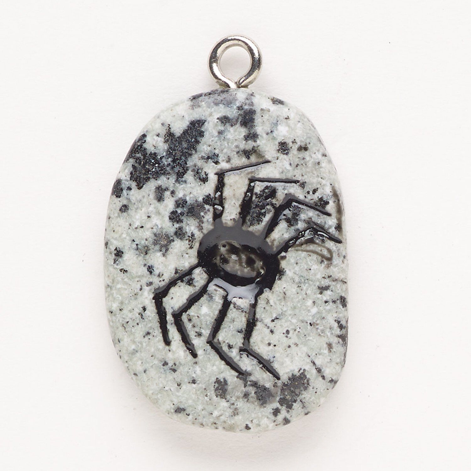 Focal, steel and sesame jasper (natural), pkg/1, silver finish and black, 30x24mm-39x27mm single-sided puffed freeform with spider, C grade.