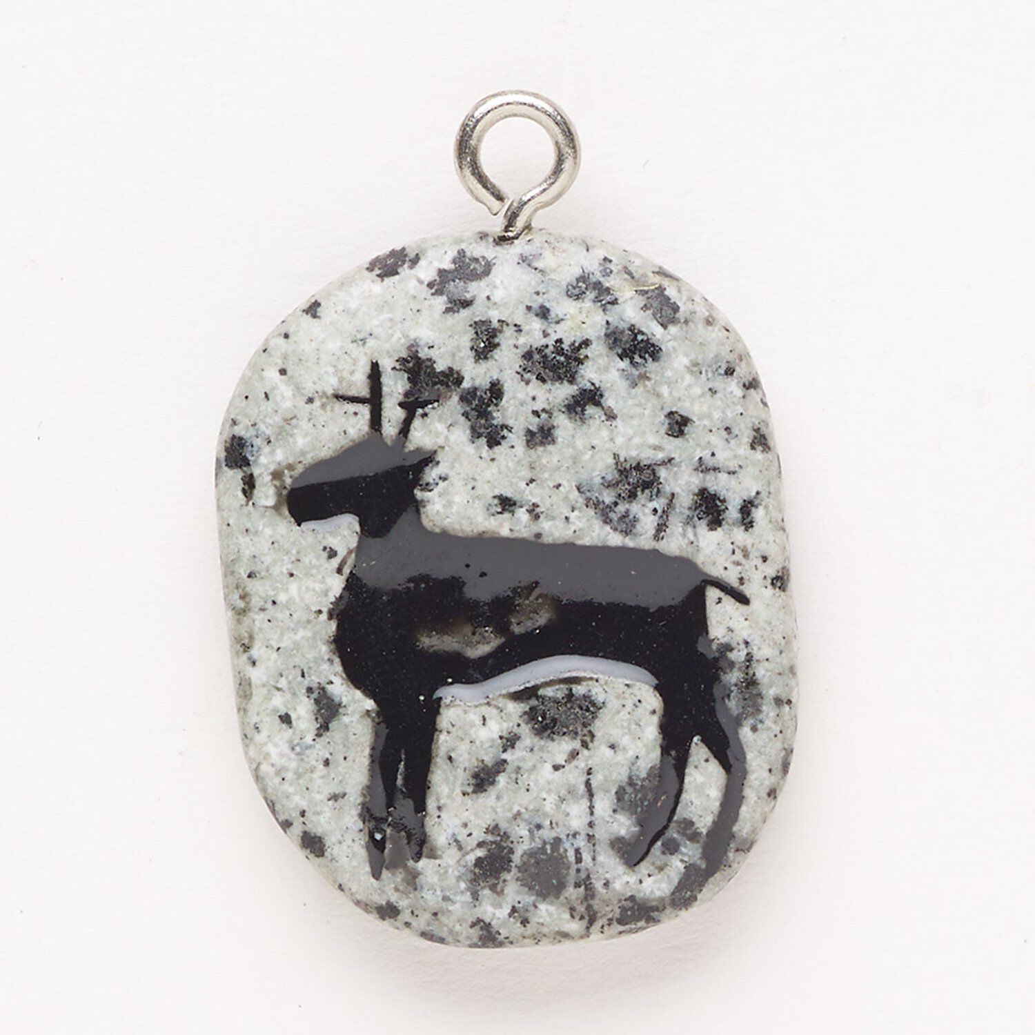 Focal, steel/sesame jasper (natural)/enamel, pkg/1, silver finish and black, 30x24mm-39x27mm puffed freeform with deer.
