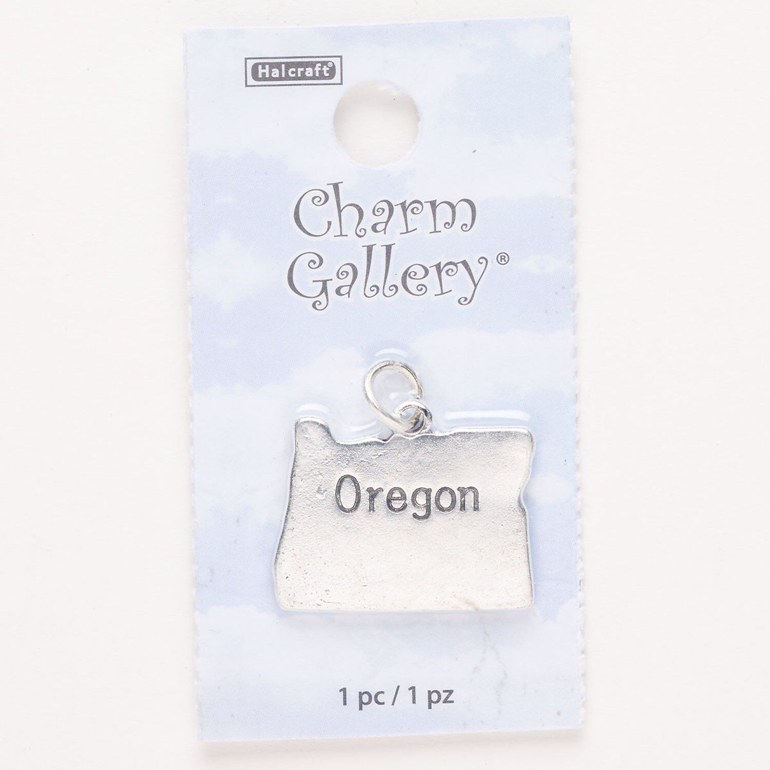 Charm, steel and enamel, pkg/1, silver finish and black, 24x18mm with "Oregon."