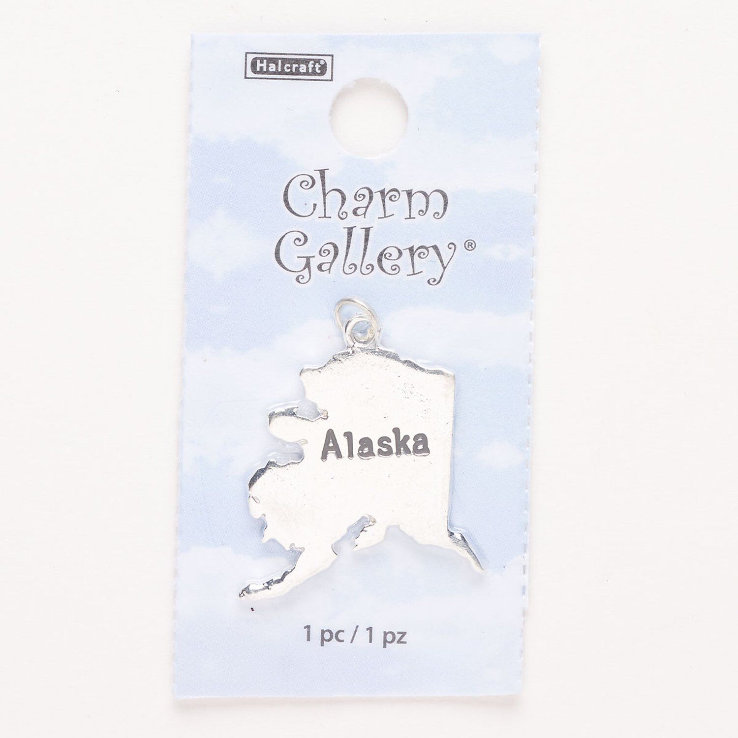 Charm, steel and enamel, pkg/1, silver finish and black, 25mm with "Alaska."