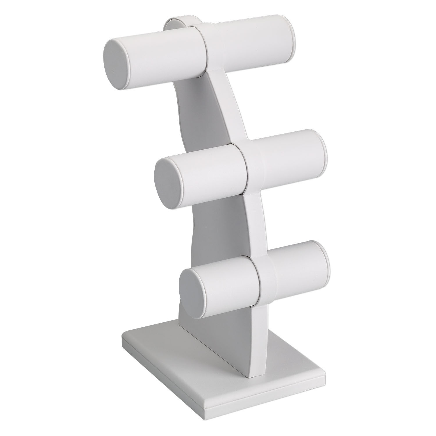 This high-volume display can be used for optimal sales potential. Three bracelet bars--the top measures 6-1/4 inches, middle is 5-1/2 inches and lowest is 4-3/4 inches wide--hold bangles, chain bracelets, cuffs and other small or large pieces. The diameter of the bar is approximately 1-1/2 inches.
