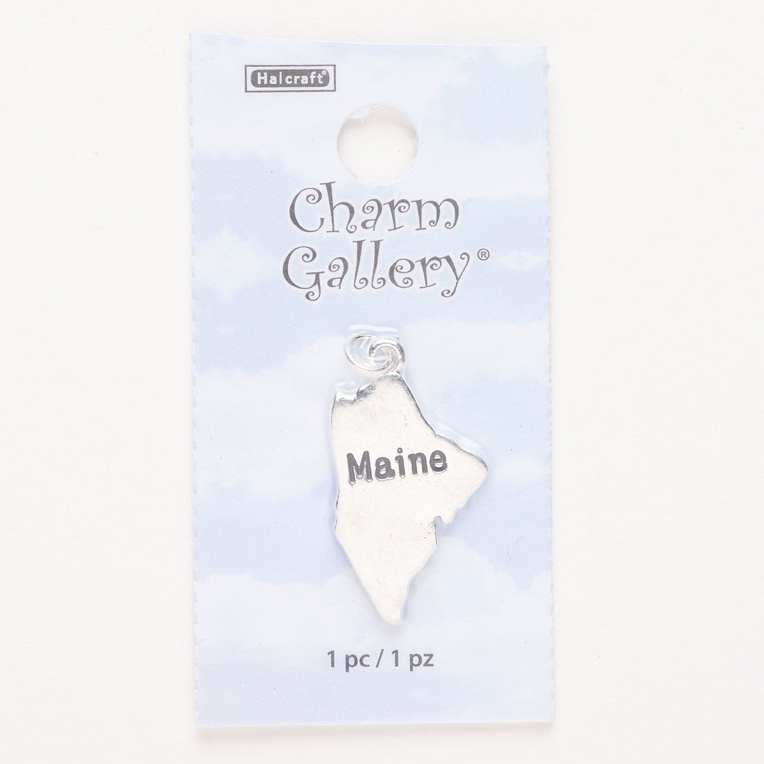 Charm, steel and enamel, pkg/1, silver finish and black, 24x17mm with "Maine."