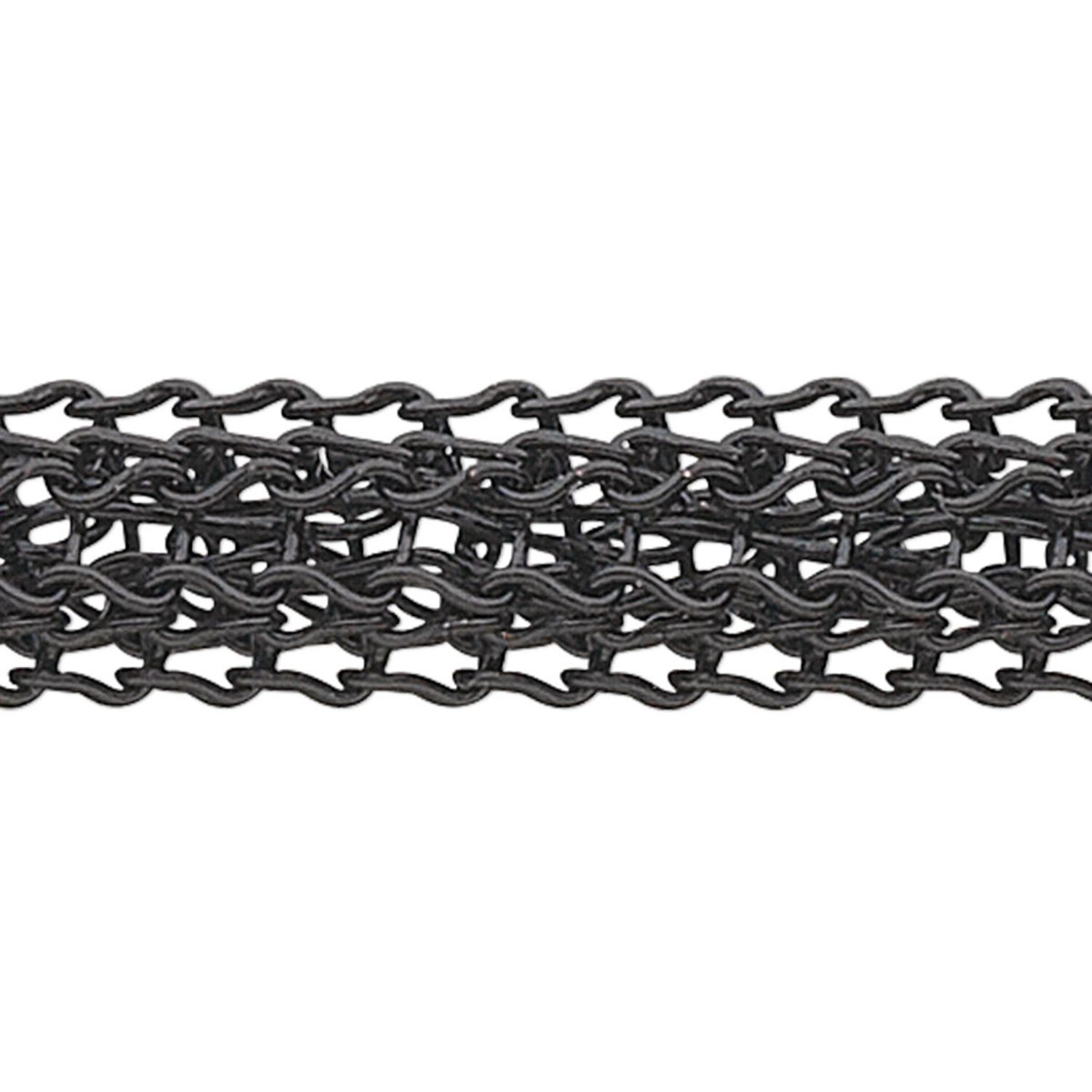 Machine-woven 0.007 fine copper wire with black enamel finish creates a flexible and supple drape, that can be knotted between beads, with the strength of heavier cord. String beads and pendants directly onto wire and glue or crimp ends into crimp tubes with loops to attach clasp. Machine-woven chain cuts easily with wire cutters and will hold its shape to support medium to heavy beads. Woven designs, sizes and colors may vary.