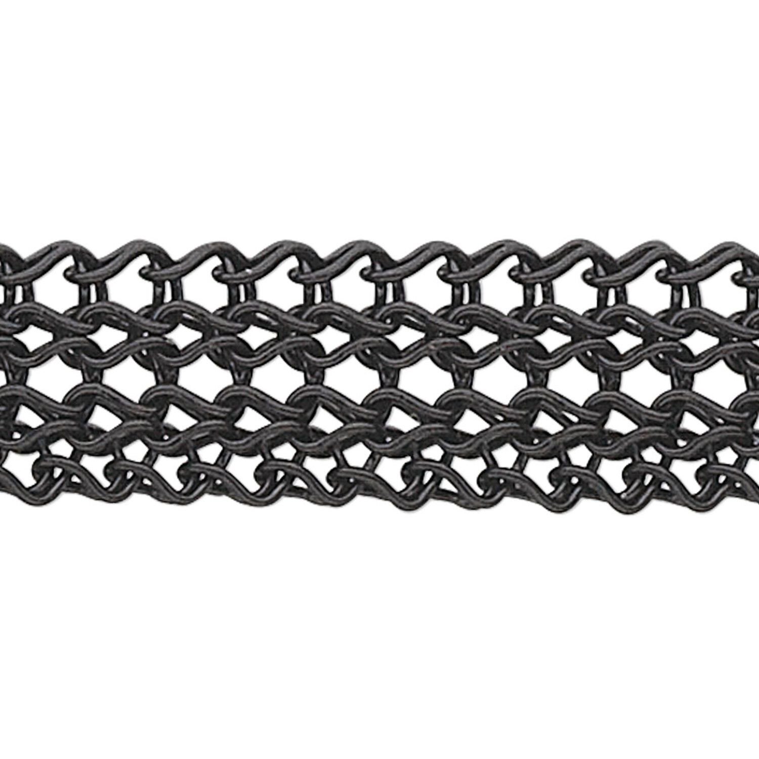 Machine-woven 0.007 fine copper wire with black enamel finish creates a flexible and supple drape, that can be knotted between beads, with the strength of heavier cord. String beads and pendants directly onto wire and glue or crimp ends into crimp tubes with loops to attach clasp. Machine-woven chain cuts easily with wire cutters and will hold its shape to support medium to heavy beads. Woven designs, sizes and colors may vary.