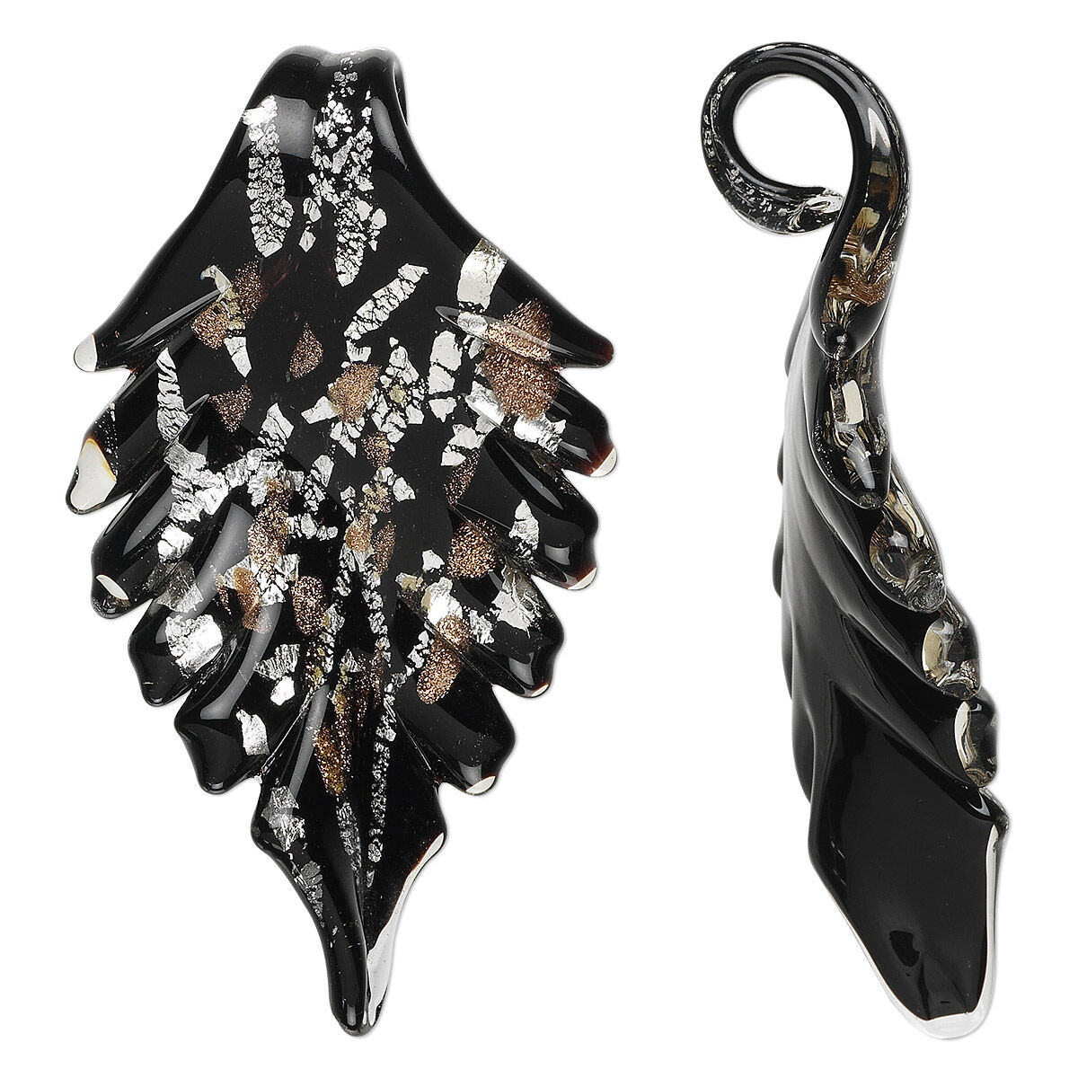 Focal, lampworked glass, black with silver- and copper-color foil, 71x40mm wavy leaf with glass bail. Sold individually.