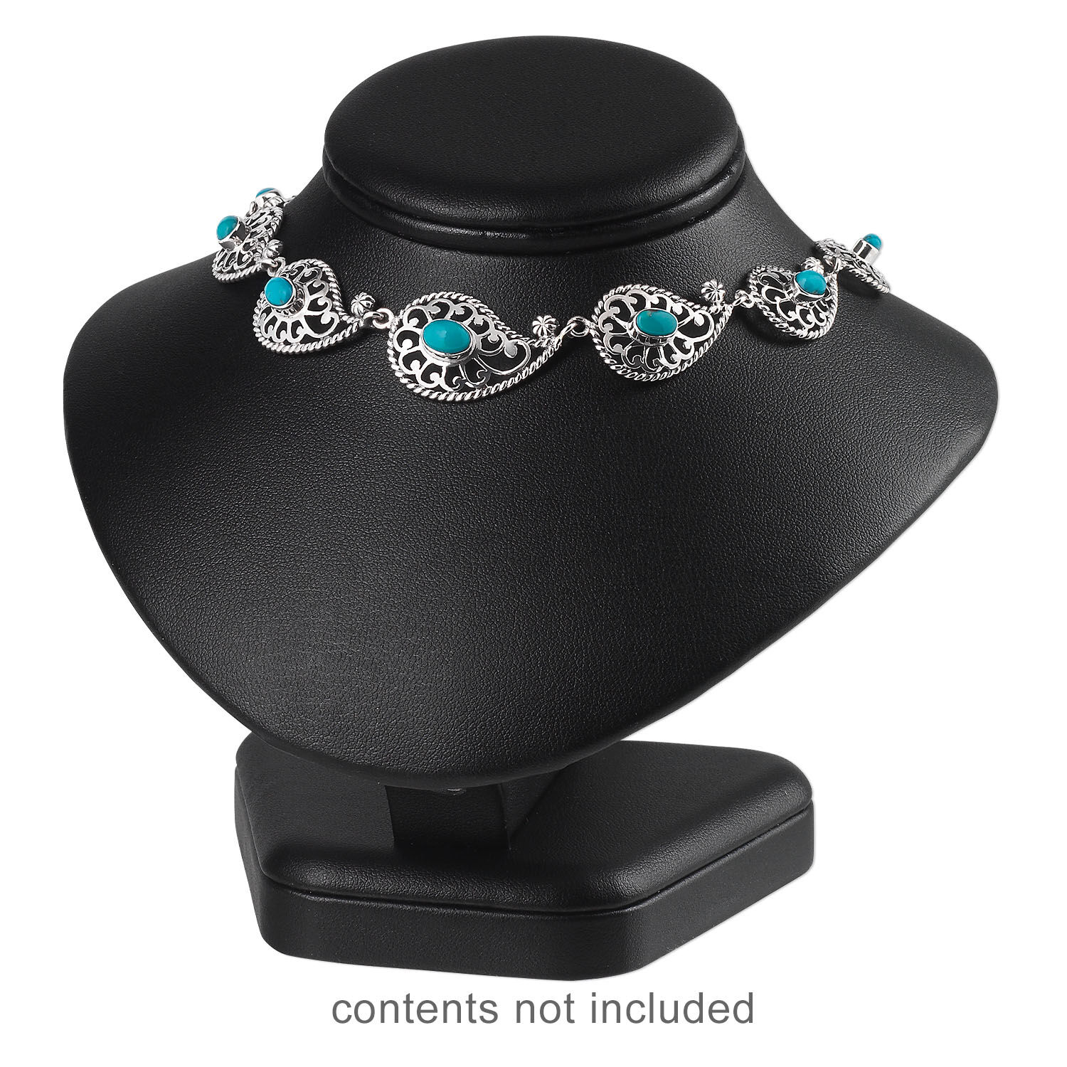 Choose this small pedestal to show a thicker chain style or wide necklace. Covered in leatherette, this display has clean lines that won't take away from the attractive design it showcases. A hook on back holds the necklace securely in place.