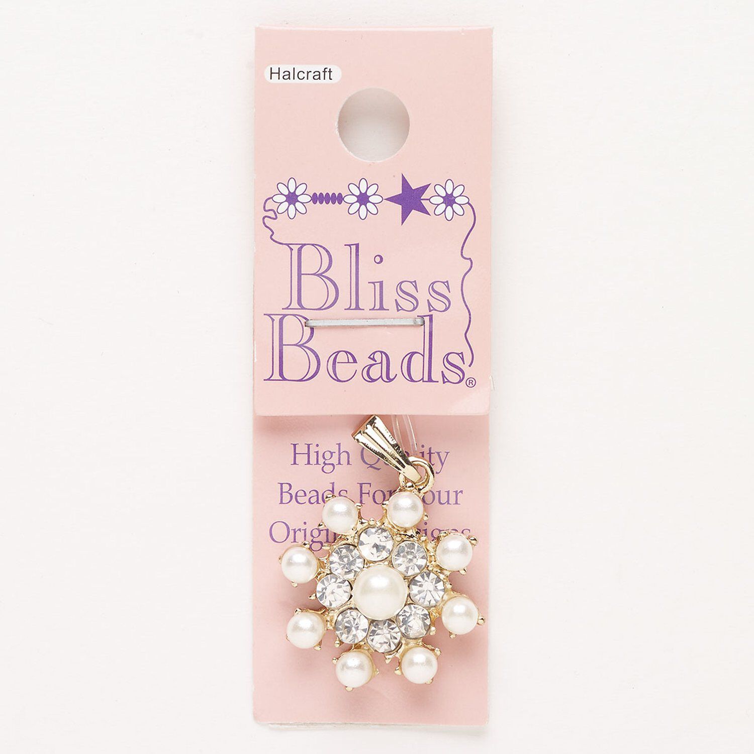 Pendant, "pewter" (zinc-based alloy)/glass/acrylic pearl, pkg/1, gold finish/clear/white, 23mm snowflake.