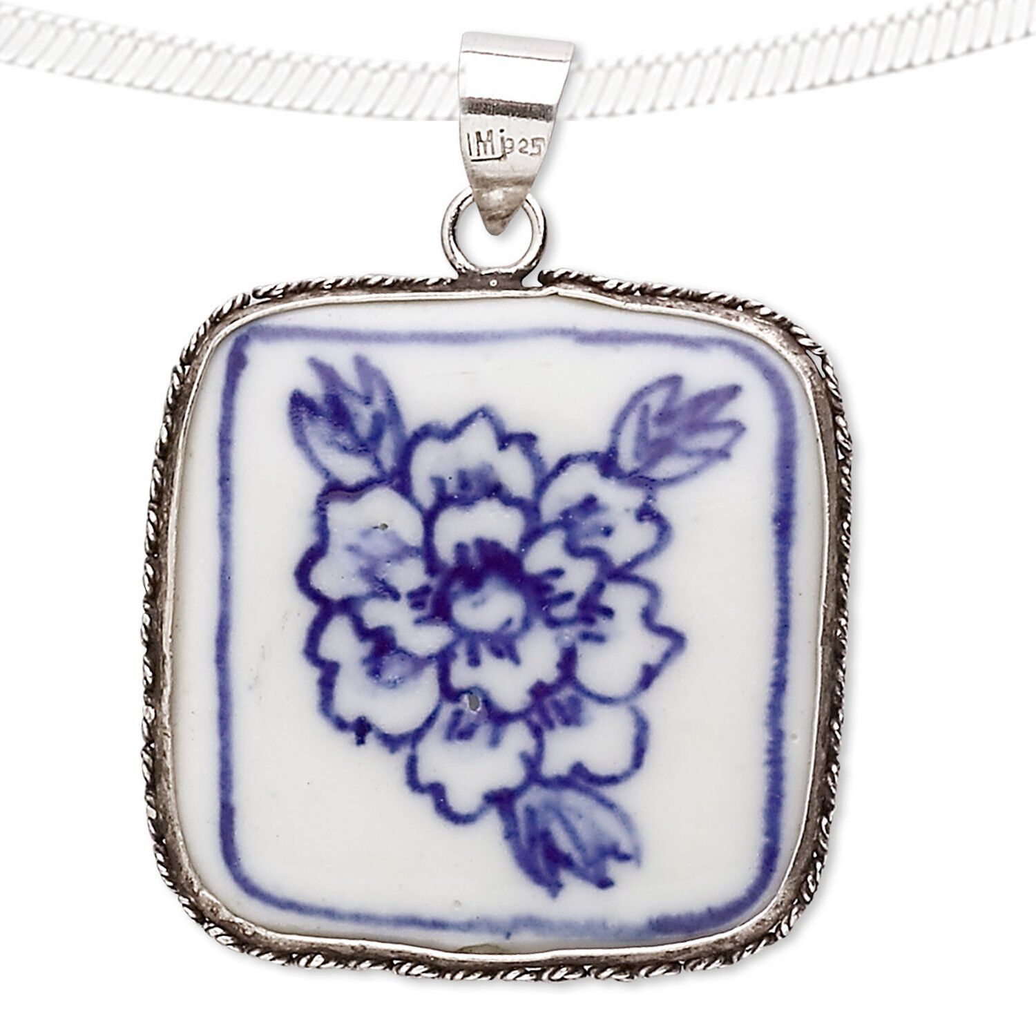 Pendant, sterling silver and porcelain, blue and white, 40x29mm square. Sold individually.