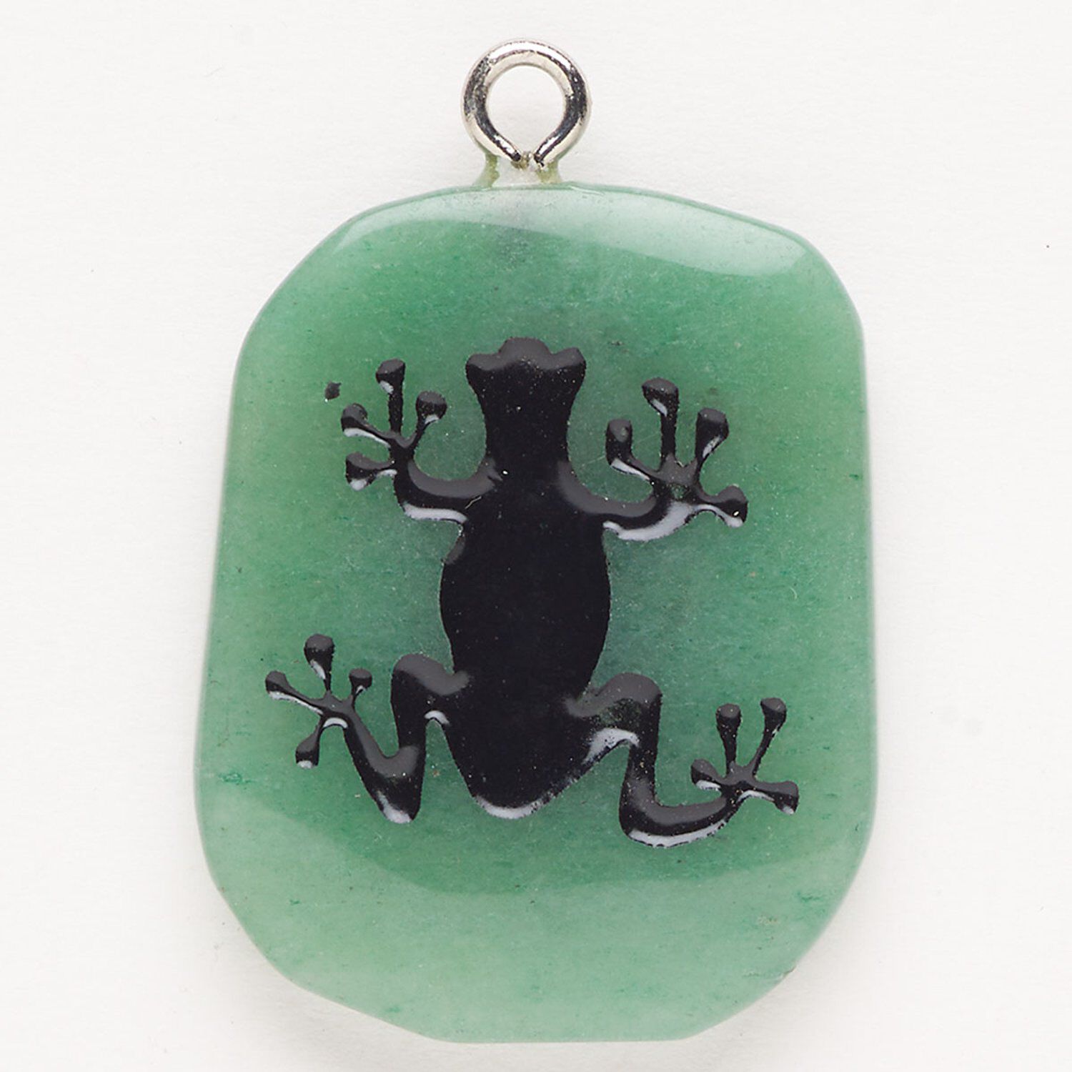 Focal, steel/green aventurine (natural)/enamel, pkg/1, silver finish and black, 30x24mm-39x27mm single-sided puffed freeform with frog, B grade.