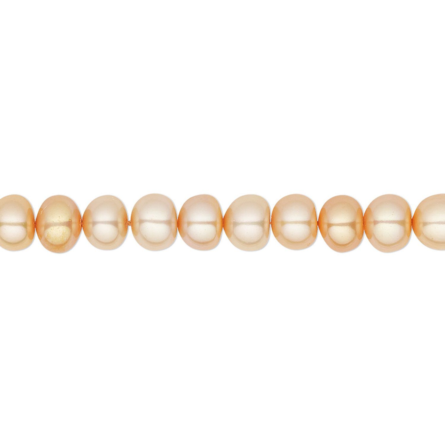 Pearl, cultured freshwater (dyed), apricot, 5-6mm button, C grade, Mohs hardness 2-1/2 to 4. Sold per 16-inch strand.