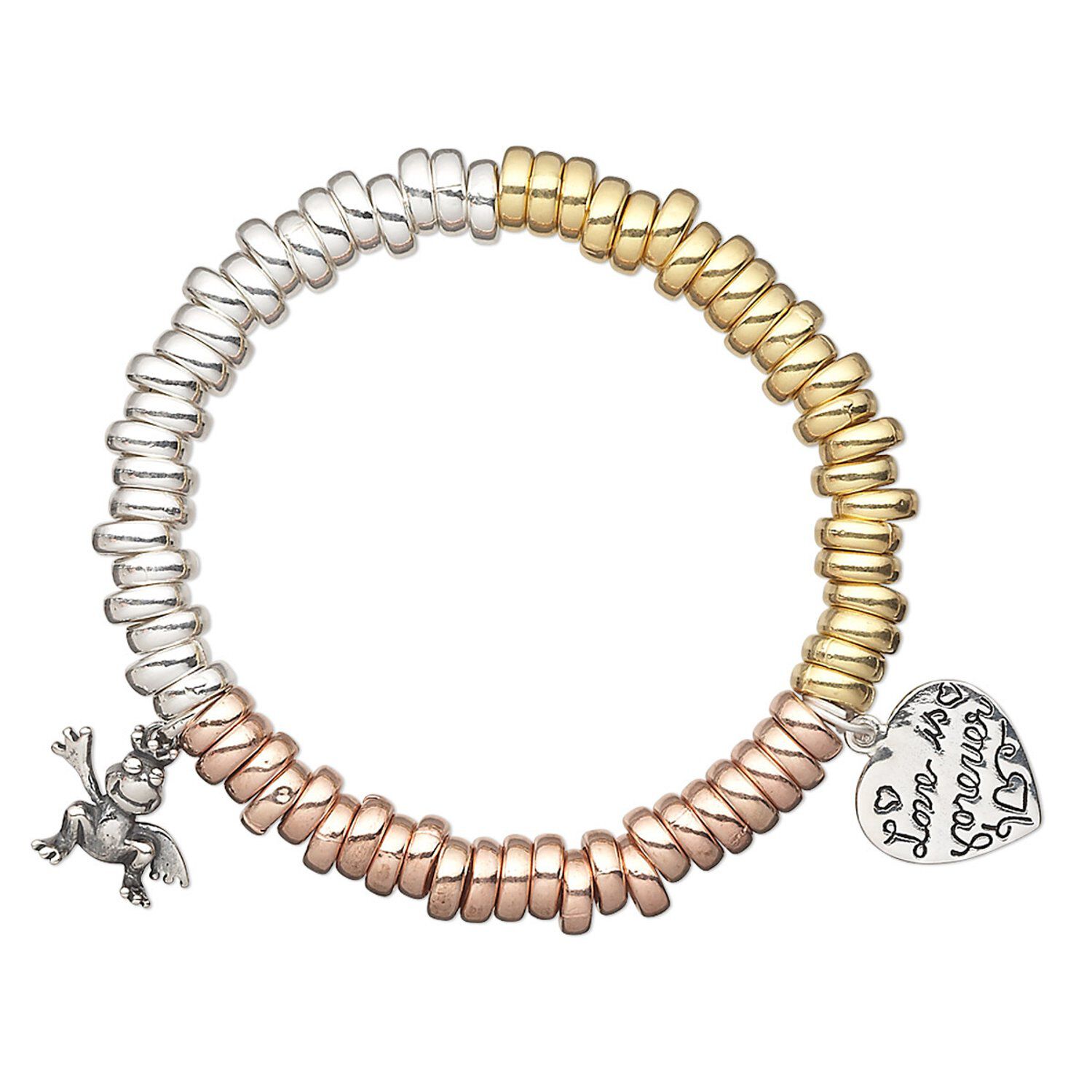 Bracelet, stretch, sterling silver / gold- / rose gold-finished sterling silver, 7x3mm rondelle with 15x13mm frog and 15x15mm heart with "Love is forever," 6 inches. Sold individually.