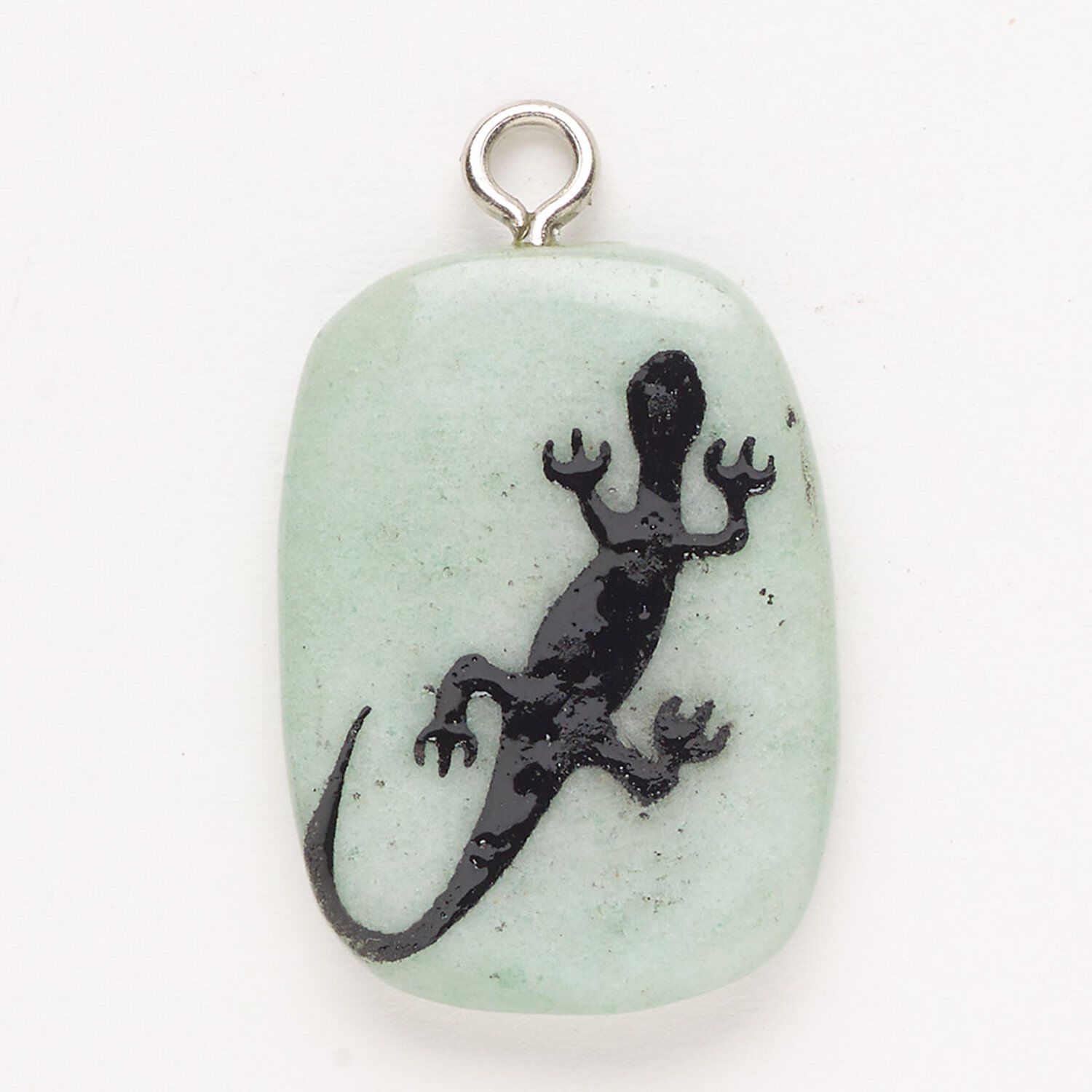 Focal, steel/green aventurine (natural)/enamel, pkg/1, silver finish and black, 30x24mm-39x27mm single-sided puffed freeform with salamander, B- grade.