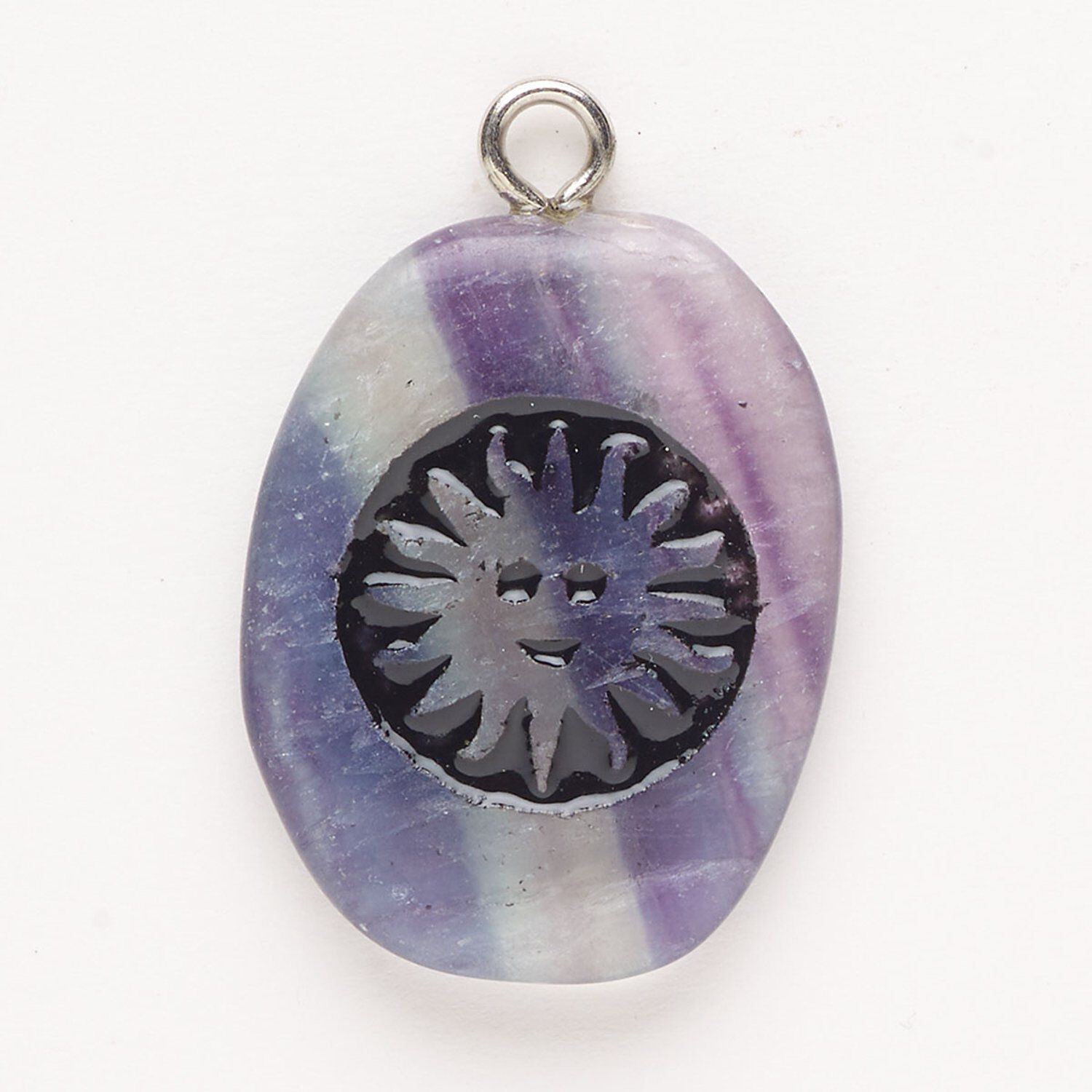 Focal, steel/rainbow fluorite (natural)/enamel, pkg/1, silver finish and black, 30x24mm-39x27mm single-sided puffed freeform with sunface, B- grade.