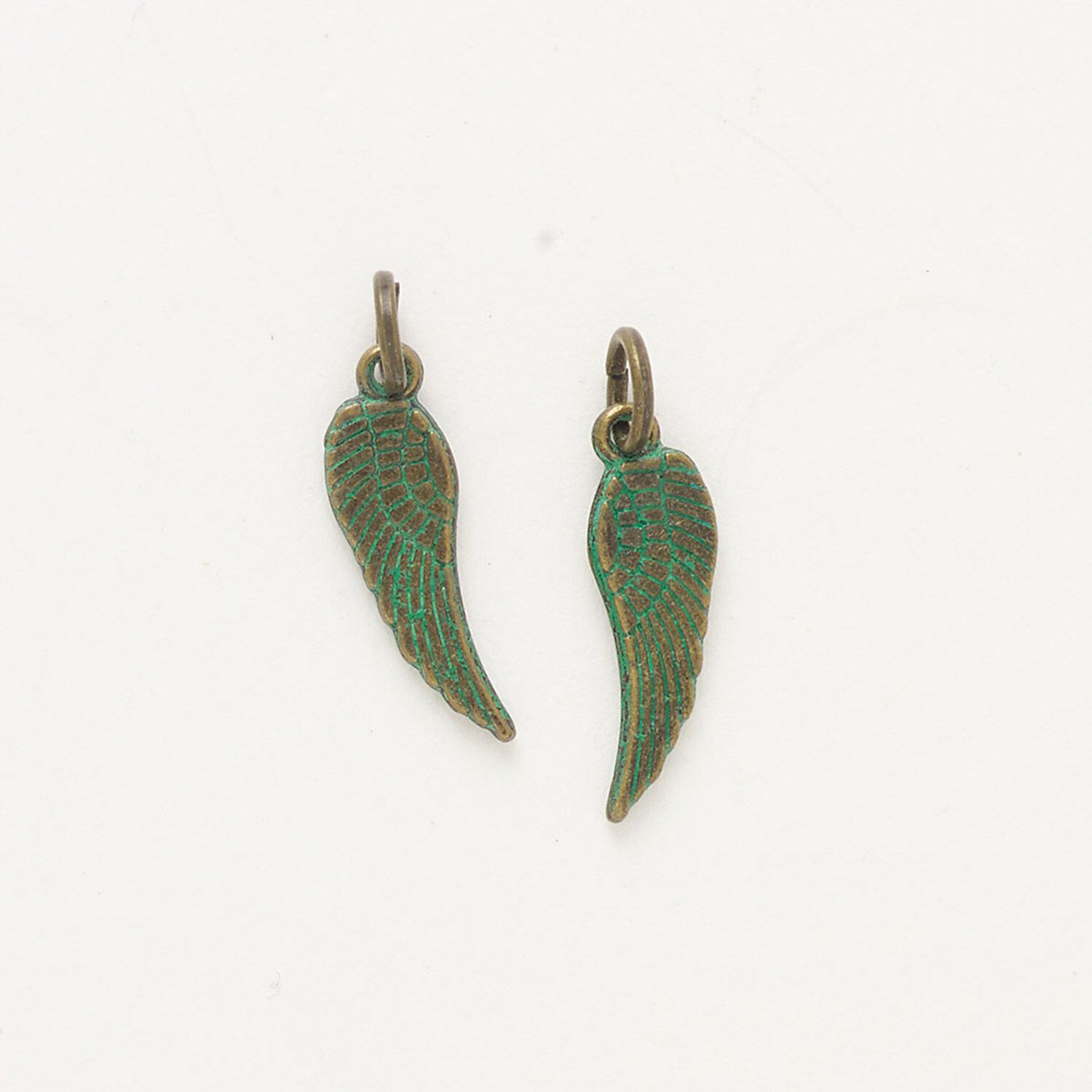 Charm, brass, pkg/2, antique silver finish green patina, 17x5mm double-sided wing.