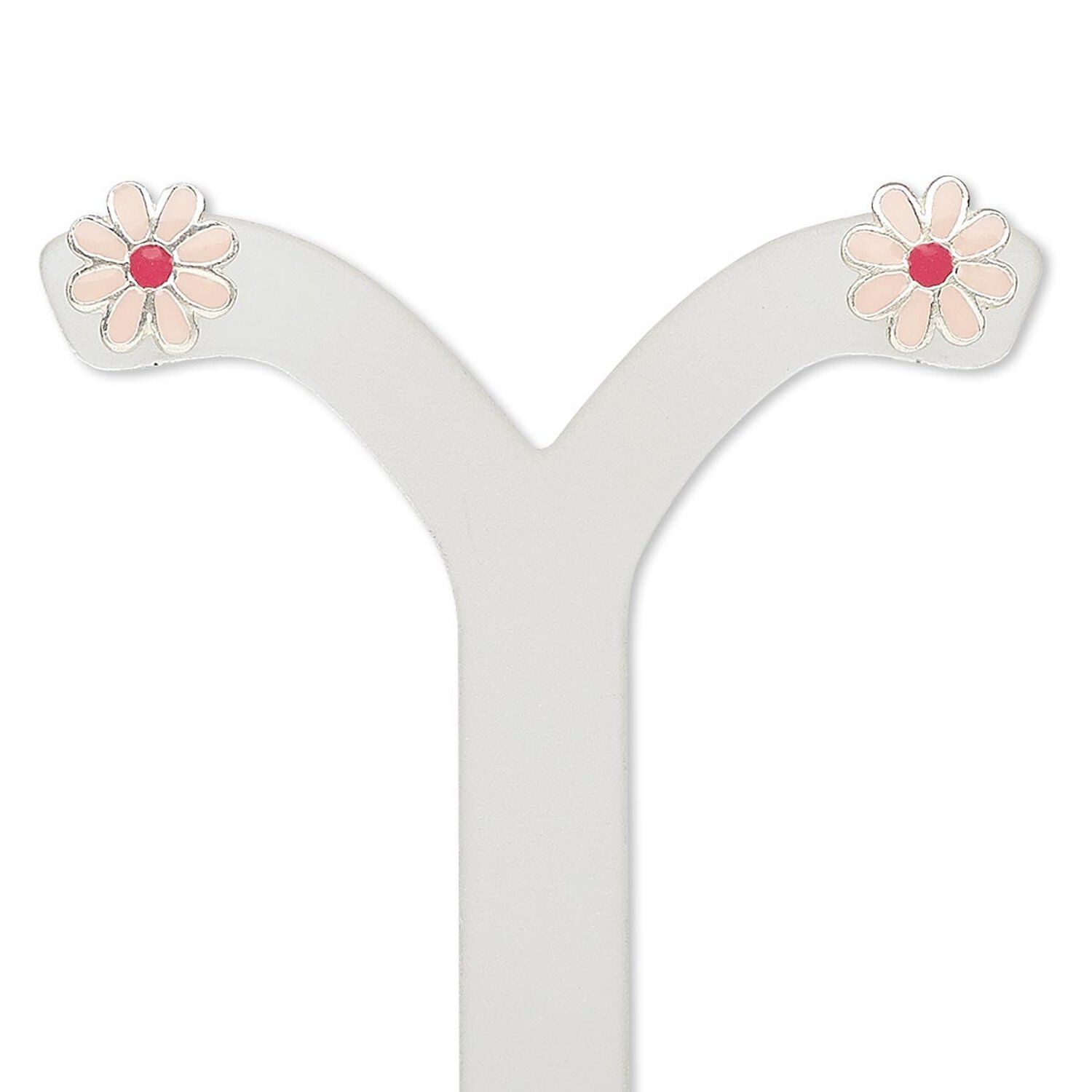 Earring, enamel and sterling silver, light pink and red, 8x8mm daisy with post. Sold per pair.