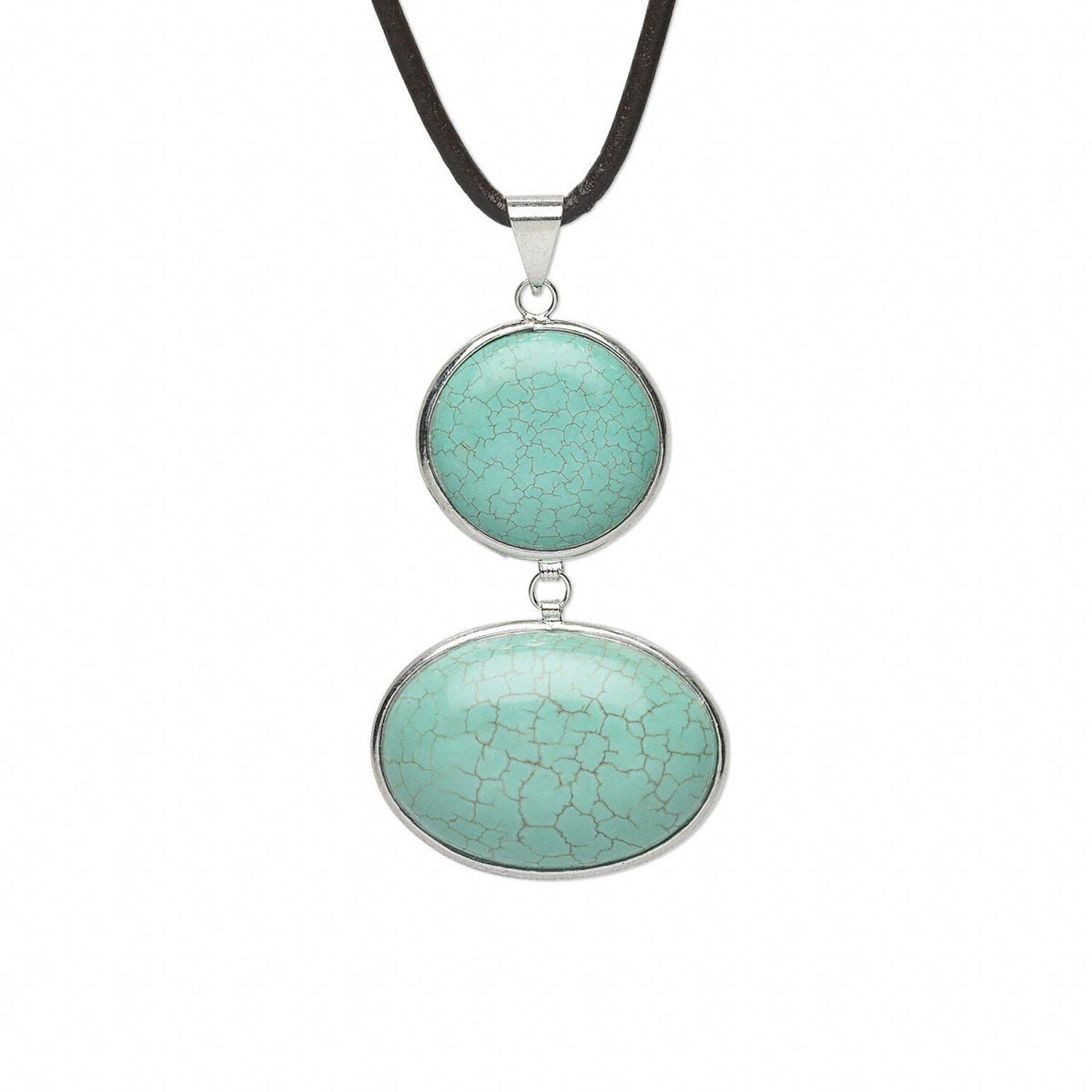 Magnesite / leather / brass 1pkg1, imitation rhodium-finished flat round oval necklace 18 inch / 2 inch extender chain / lobster claw clasp