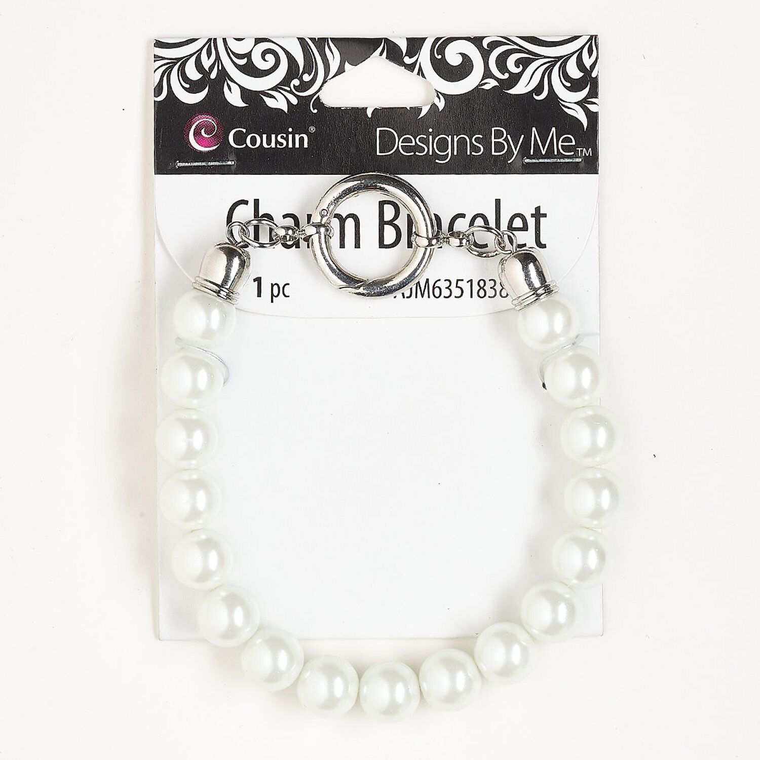Bracelet, silver-finished steel and acrylic pearl, white, 8 inches with self-closing clasp. Sold individually.