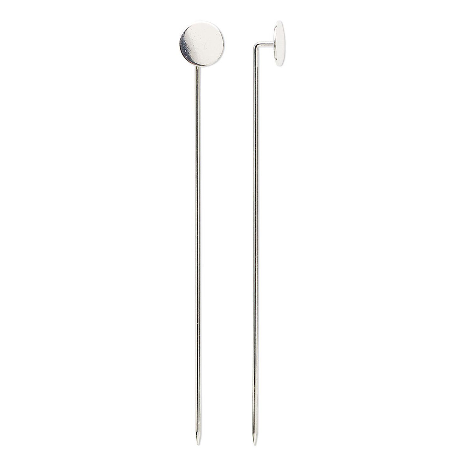 Stick pin, silver-finished brass, 2-3/4 inches with 8mm round flat pad, 18 gauge. Sold per pkg of 100.