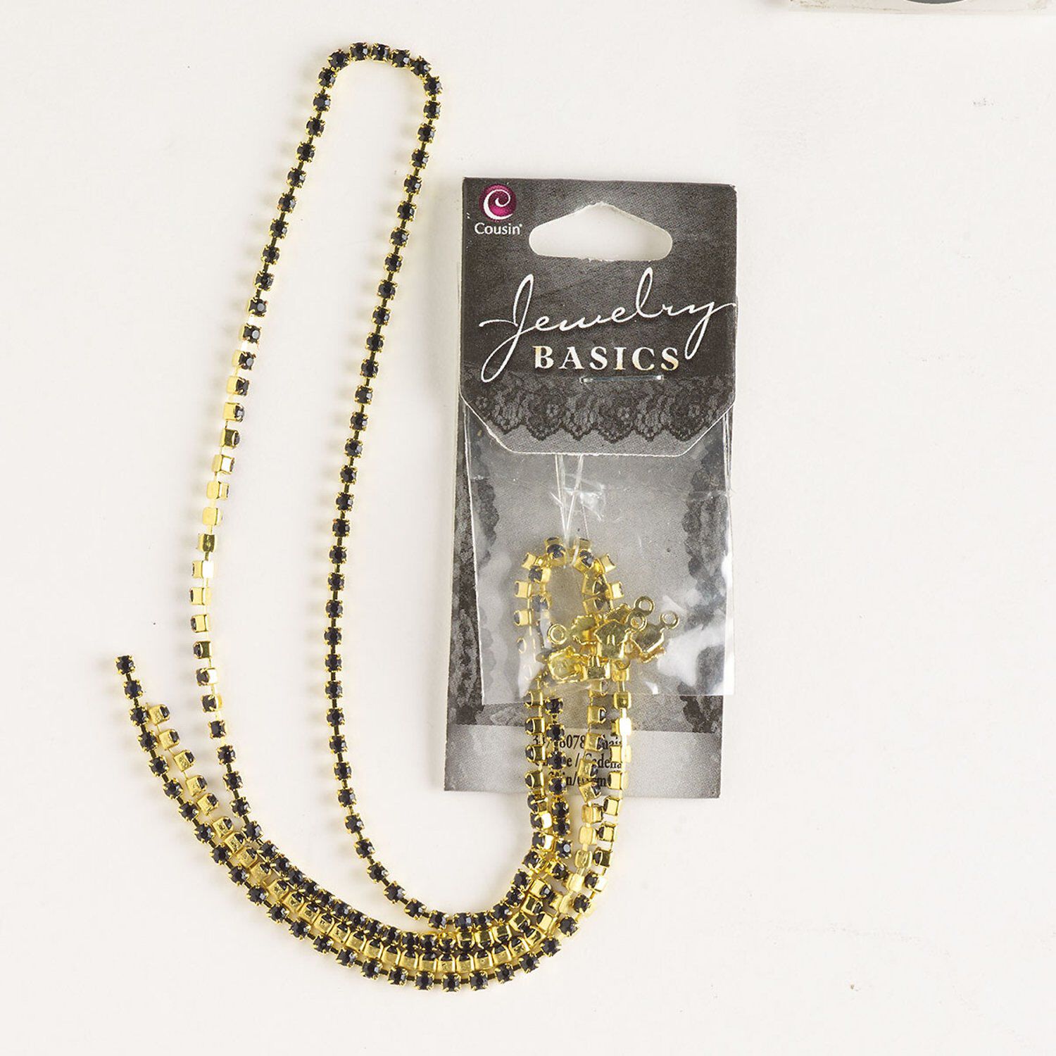 Cupchain, gold-finished brass and glass, black, 2mm wide, 24 inches with (8) connectors. Sold individually.