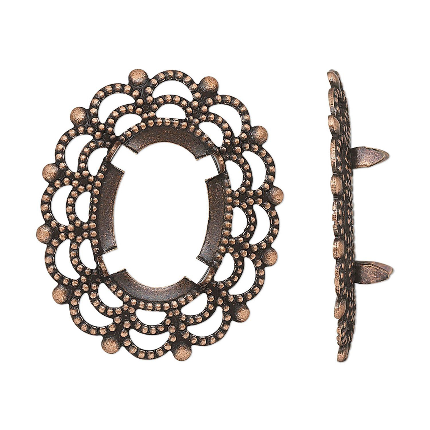 Component, antique copper-plated brass, 30x25mm oval with 18x13mm 4-prong oval setting. Sold per pkg of 12.