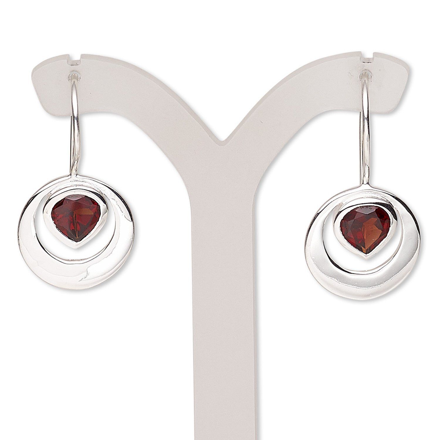 Earring, garnet (natural) and sterling silver, 29mm with 7x7mm faceted teardrop and fishhook ear wire. Sold per pair.