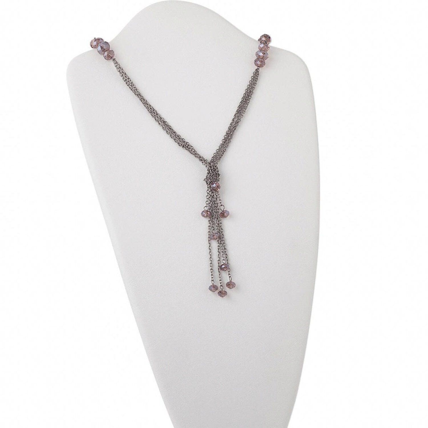 A stylish lariat-style necklace with a knotted center and dangles of faceted glass beads ready for resale or to be worn. Colors, shapes and sizes may vary in each lot.