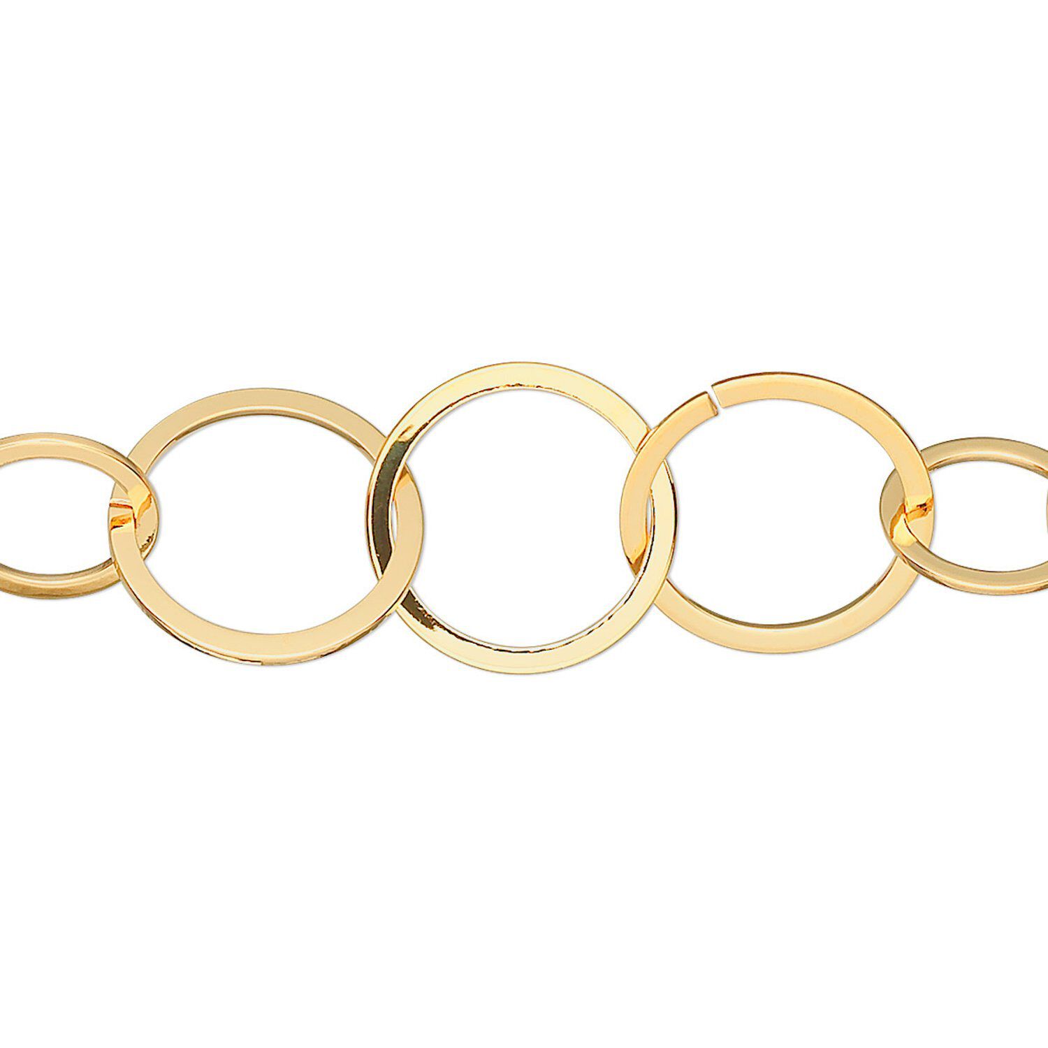 Lightweight and easy to use gold-plated brass chain with 14mm flat round links. Large links open and close so no cutting is required and no waste necessary. Smaller links are closed.