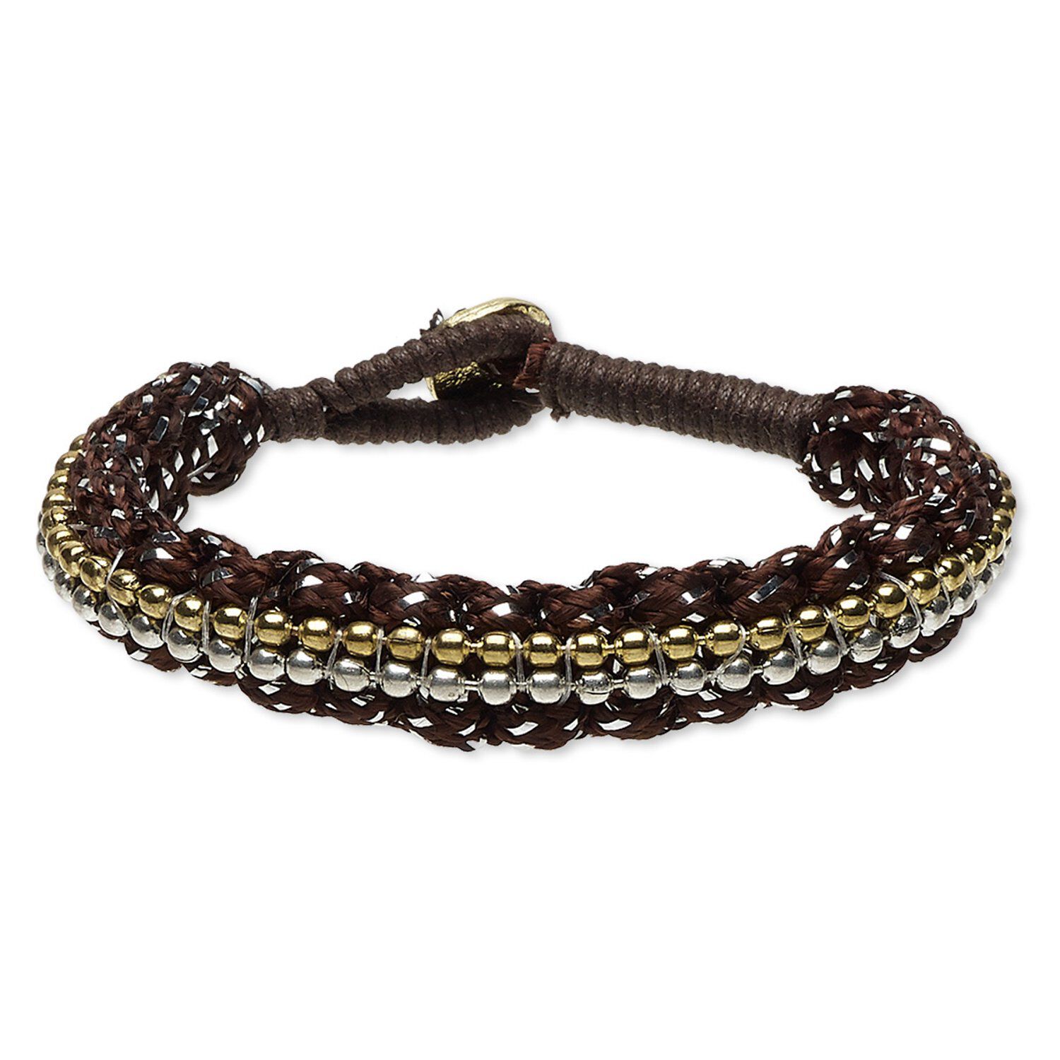 Bracelet, waxed cotton cord / nylon / gold-finished "pewter" (zinc-based alloy) / steel / silver-plated steel, brown, 11mm wide, 6-1/2 inches with button clasp. Sold individually.