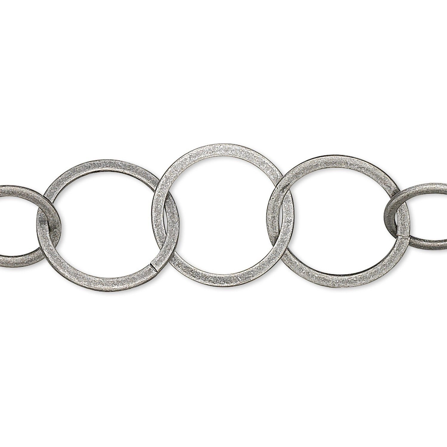 Lightweight and easy to use. Antique silver-plated brass chain with 14mm flat round links. Large links open and close so no cutting is required and no waste necessary. Smaller links are closed.