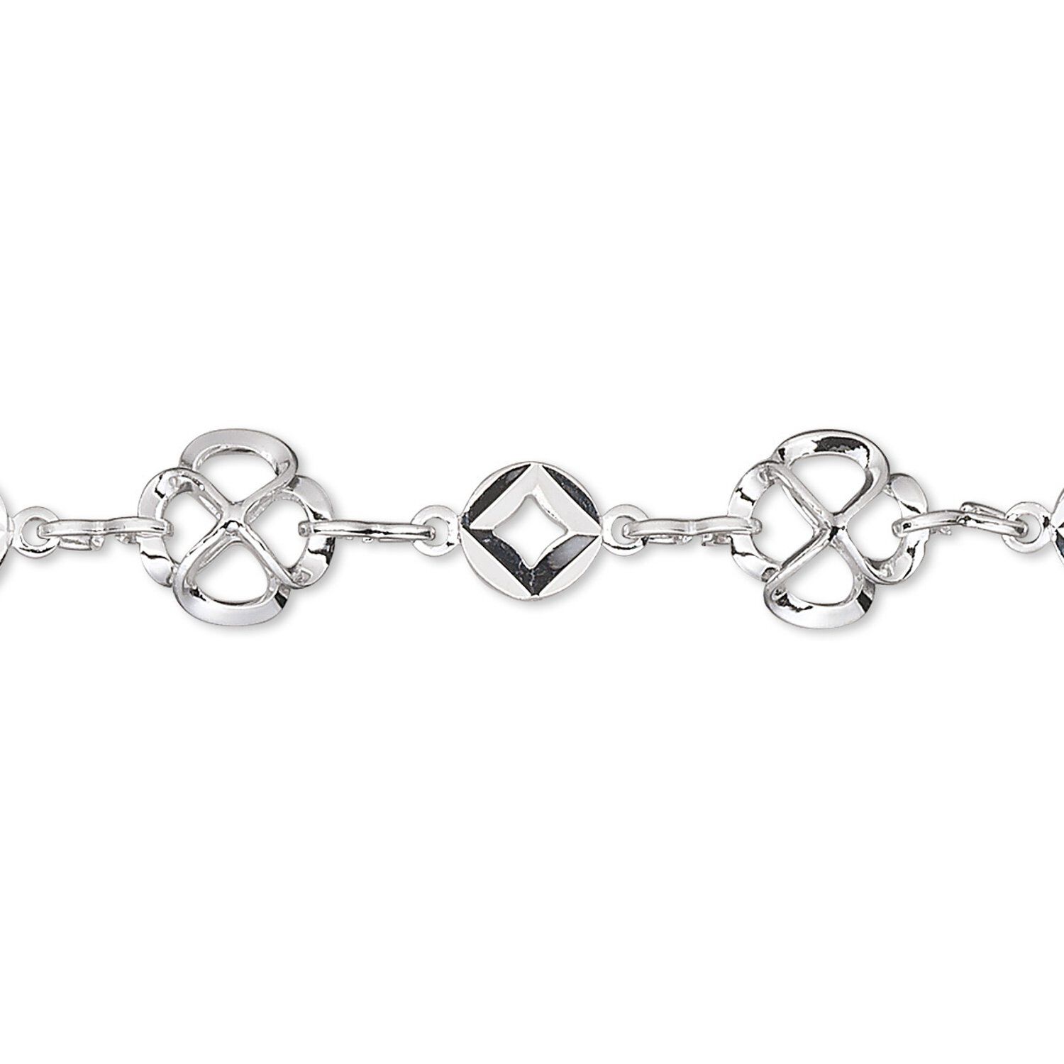 Lightweight and easy to use. Shiny silver-plated brass chain with round and flower links. Figure-eight connector links open and close so no cutting is required and no waste necessary.