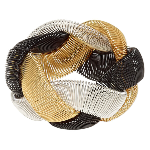 Metal coil bracelet is super lightweight, slinky and fun to wear--and easy to resell. Braided design features three finishes/platings, complementing a variety of styles. Wire coil seam is concealed inside the bracelet, mechanically fixed in place and glued for additional security and to prevent discomfort. Colors, shapes and sizes may vary in each lot.