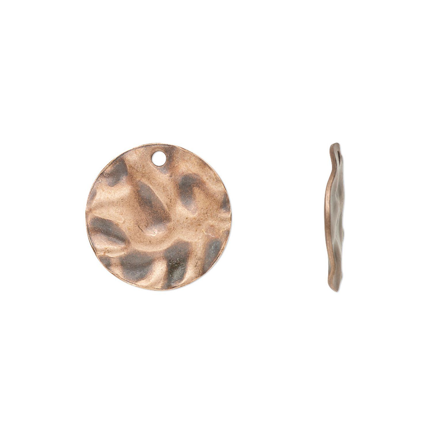 Drop, antique copper-plated steel, 15mm textured flat round. Sold per pkg of 50.