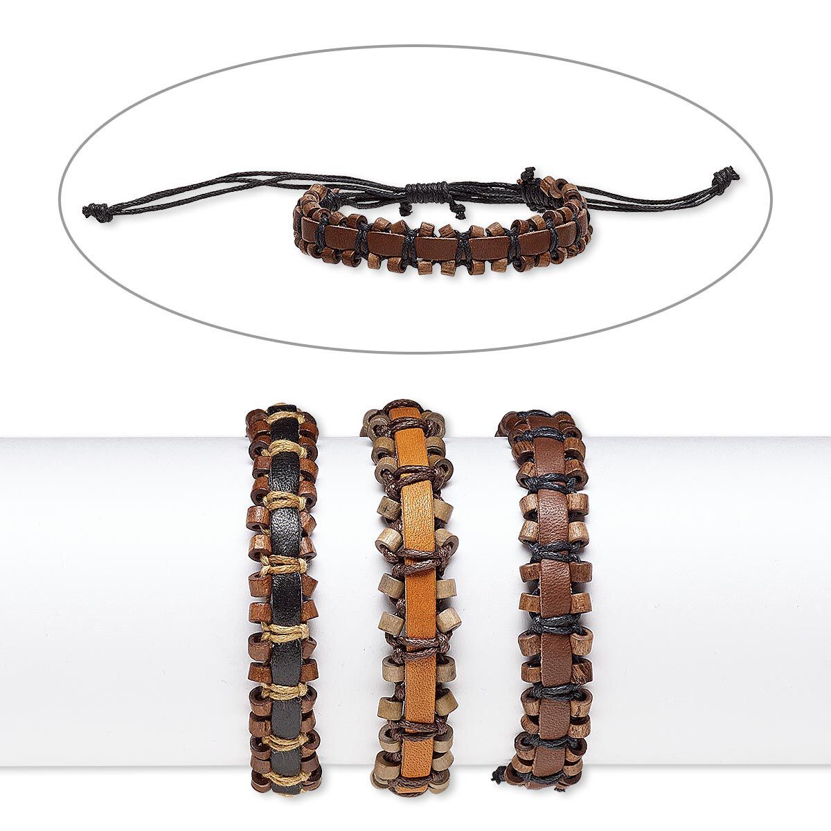 Bracelet mix, leather (dyed) / stained wood / waxed cotton cord, mixed colors, 13mm wide, adjustable from 6-9 inches with knot closure. Sold per pkg of 3.