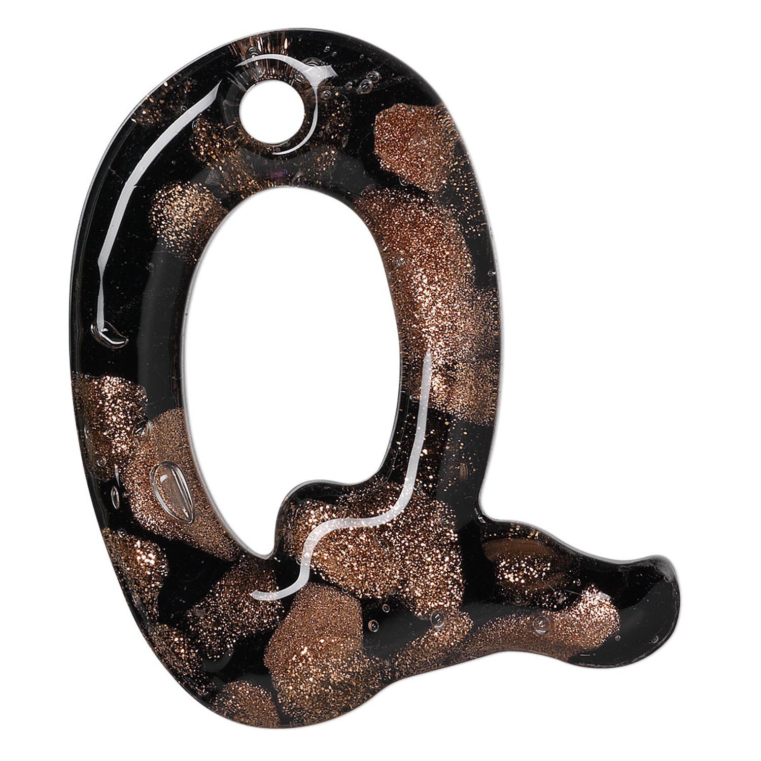 Focal, lampworked glass, semitransparent black and clear with copper-colored glitter, 44x35mm single-sided letter Q with 3.5-4.5mm hole. Sold individually.